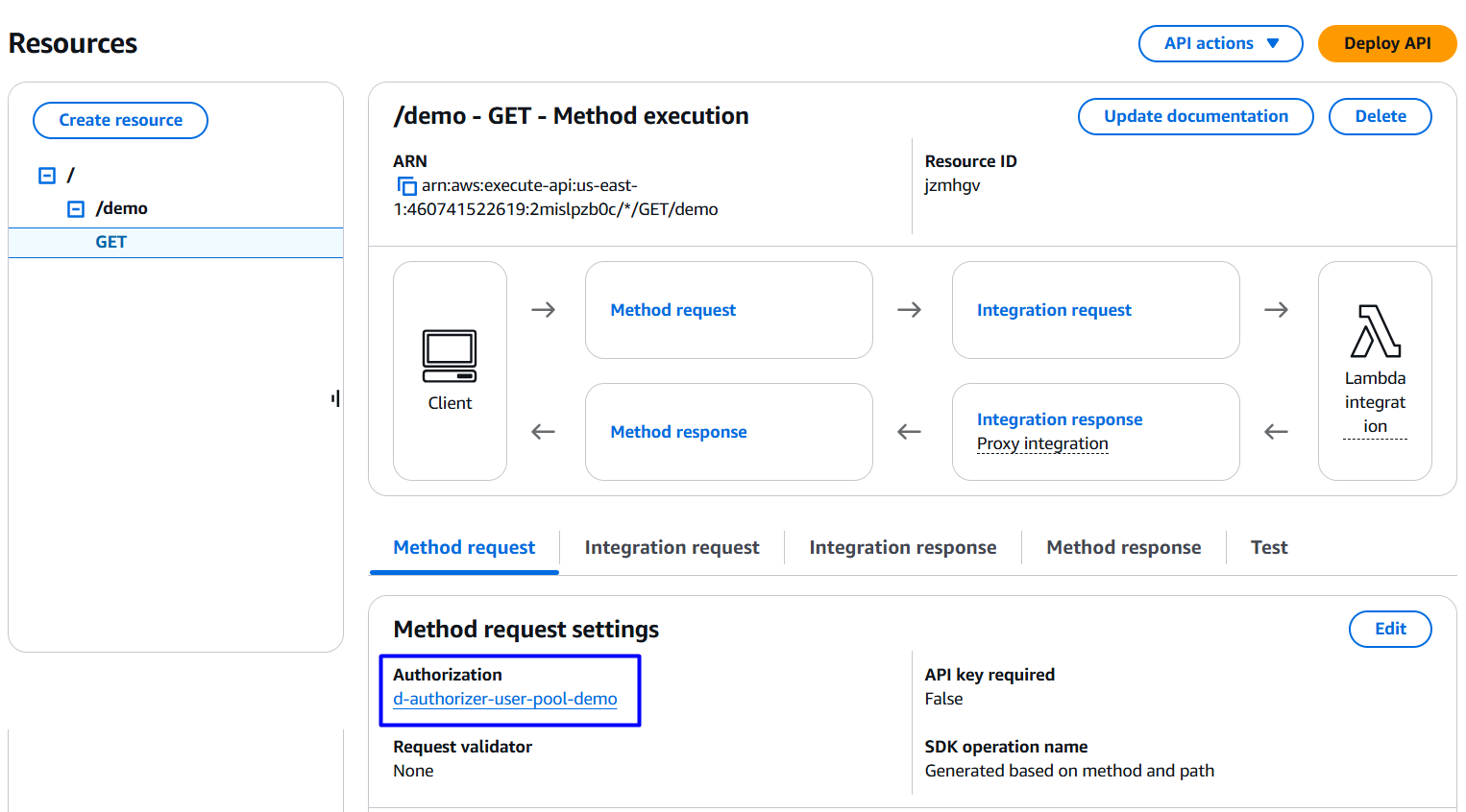 - API Gateway sẽ dùng Cognito Authorizer để kiểm tra token đó. Nếu token hợp lệ, request sẽ được chuyển tiếp đến backend (ví dụ như Lambda, S3, v.v). Nếu token không hợp lệ hoặc thiếu, request sẽ bị từ chối ngay tại API Gateway và trả lỗi 401 Unauthorized.