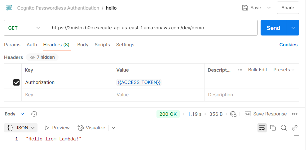 Trong bài lab này, chúng ta sẽ từng bước xây dựng một hệ thống API được bảo vệ bằng Cognito Authorizer, từ việc tạo một Lambda function đơn giản để xử lý logic backend – đây sẽ là đích đến của các request thông qua API Gateway. Tiếp theo, bạn sẽ tạo một Cognito User Pool để quản lý người dùng và xác thực với Passwordless. Sau đó, sẽ triển khai một REST API Gateway, tích hợp với Lambda vừa tạo. Tiếp theo, sẽ cấu hình Cognito Authorizer trên API Gateway để xác thực các request dựa trên JWT token do Cognito phát hành. Khi cấu hình xong, sẽ tạo một user trong Cognito User Pool, và dùng Postman để mô phỏng quá trình đăng nhập, lấy token, và gọi API – xác minh rằng hệ thống hoạt động đúng như mong đợi: chỉ những request có token hợp lệ mới được phép truy cập API.