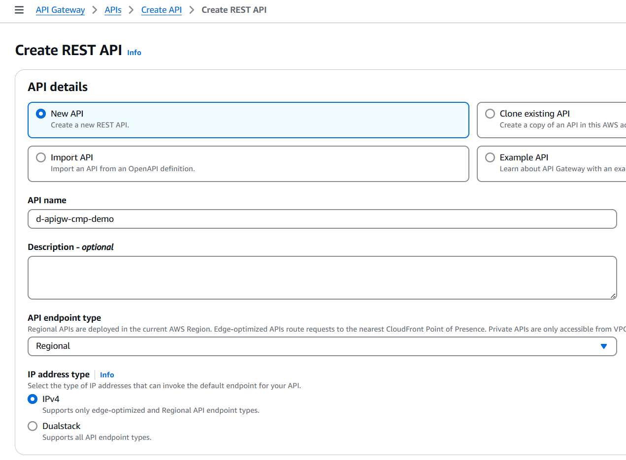 Vào API Gateway Console -> APIs -> Create API -> REST API -> Build