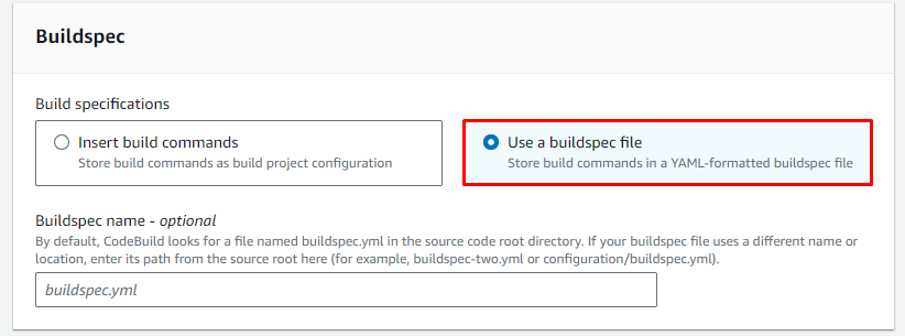 Vì trong source code của chúng ta đã có file tên buildspec.yml nên không cần phải ghi rõ tên