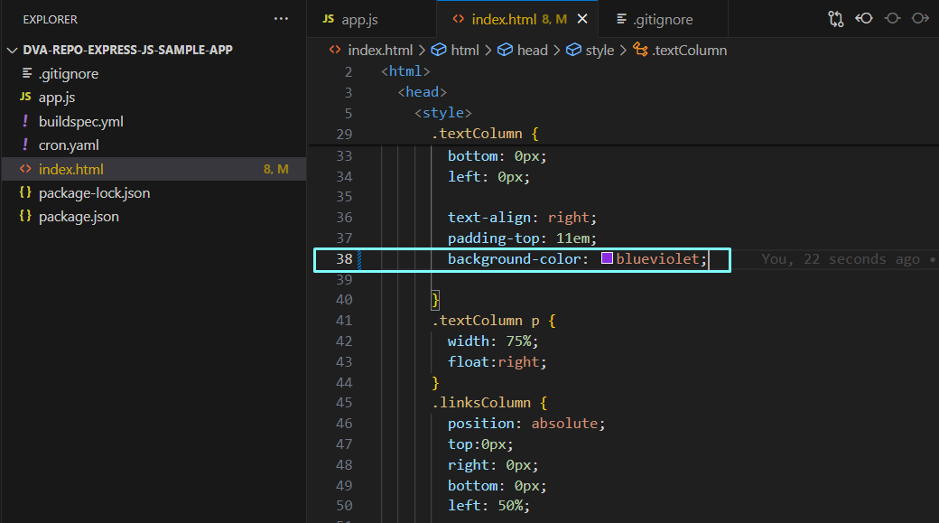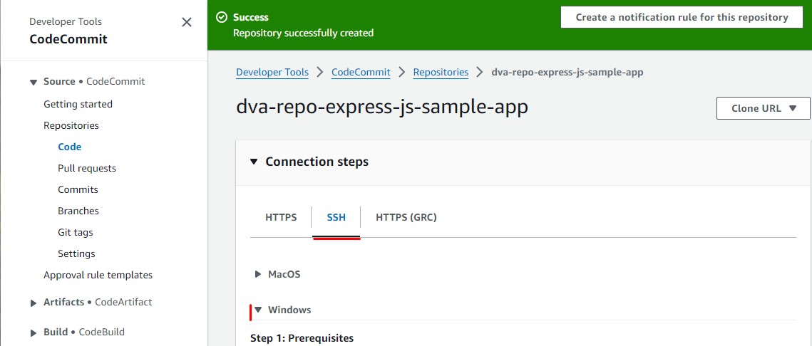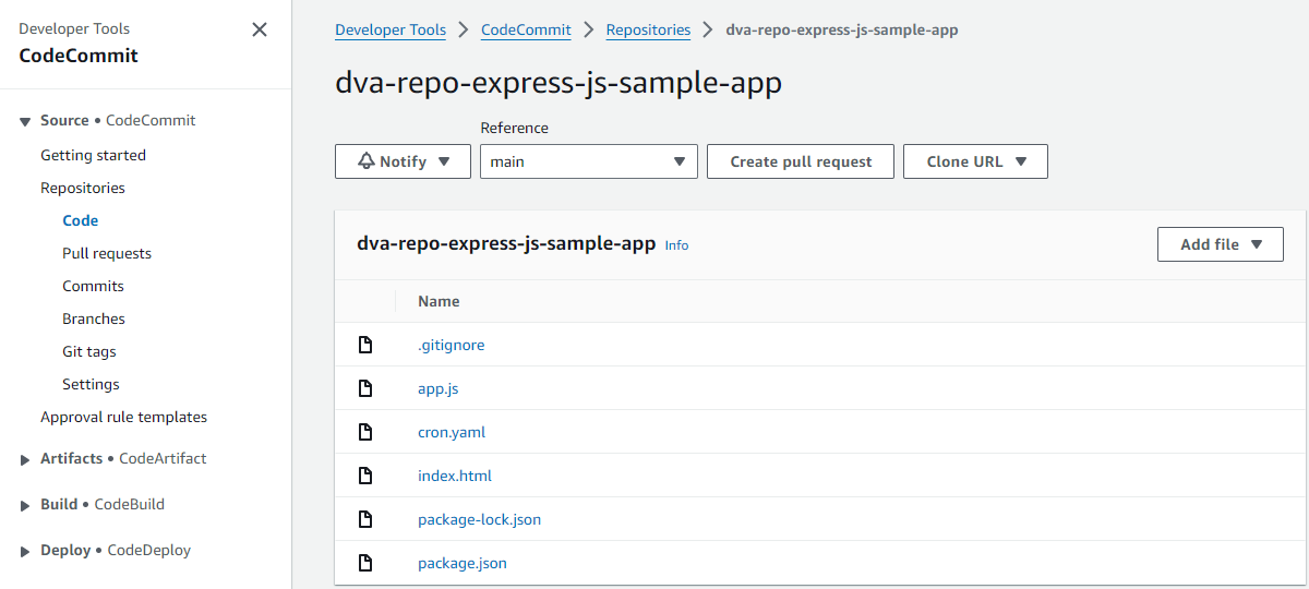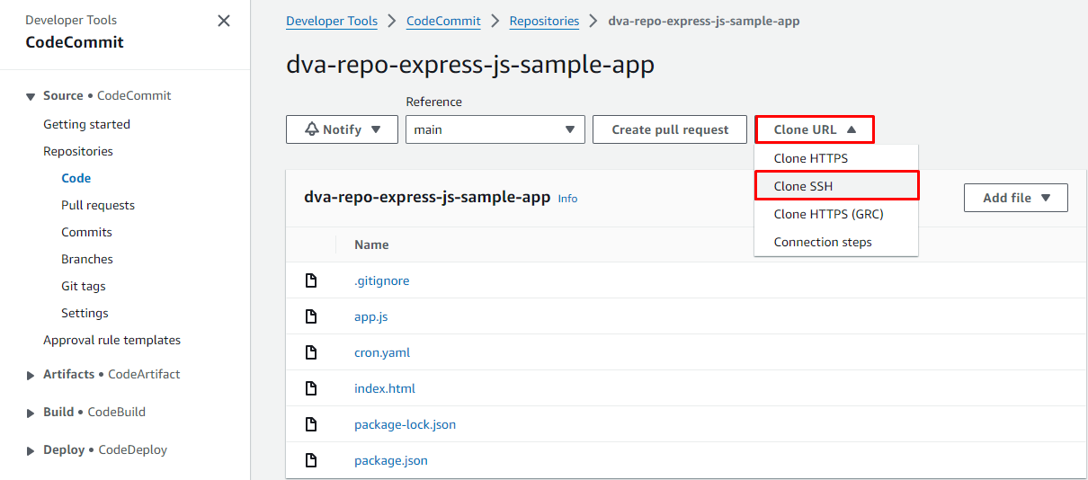 git clone ssh://git-codecommit.us-east-1.amazonaws.com/v1/repos/dva-repo-express-js-sample-app