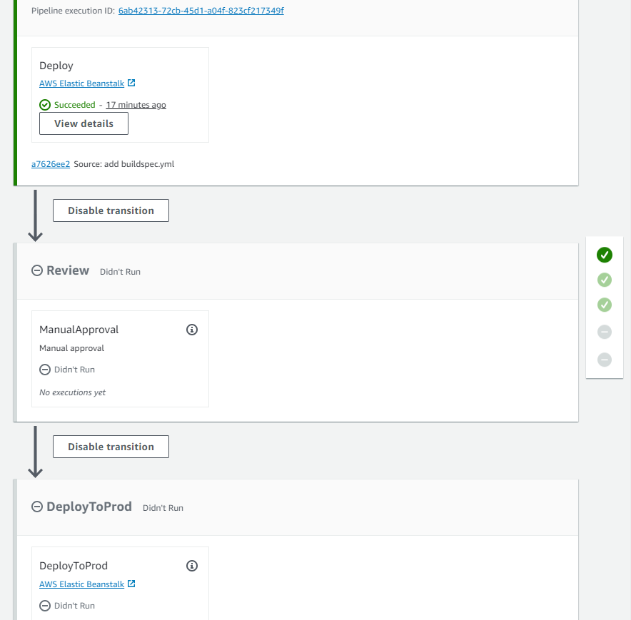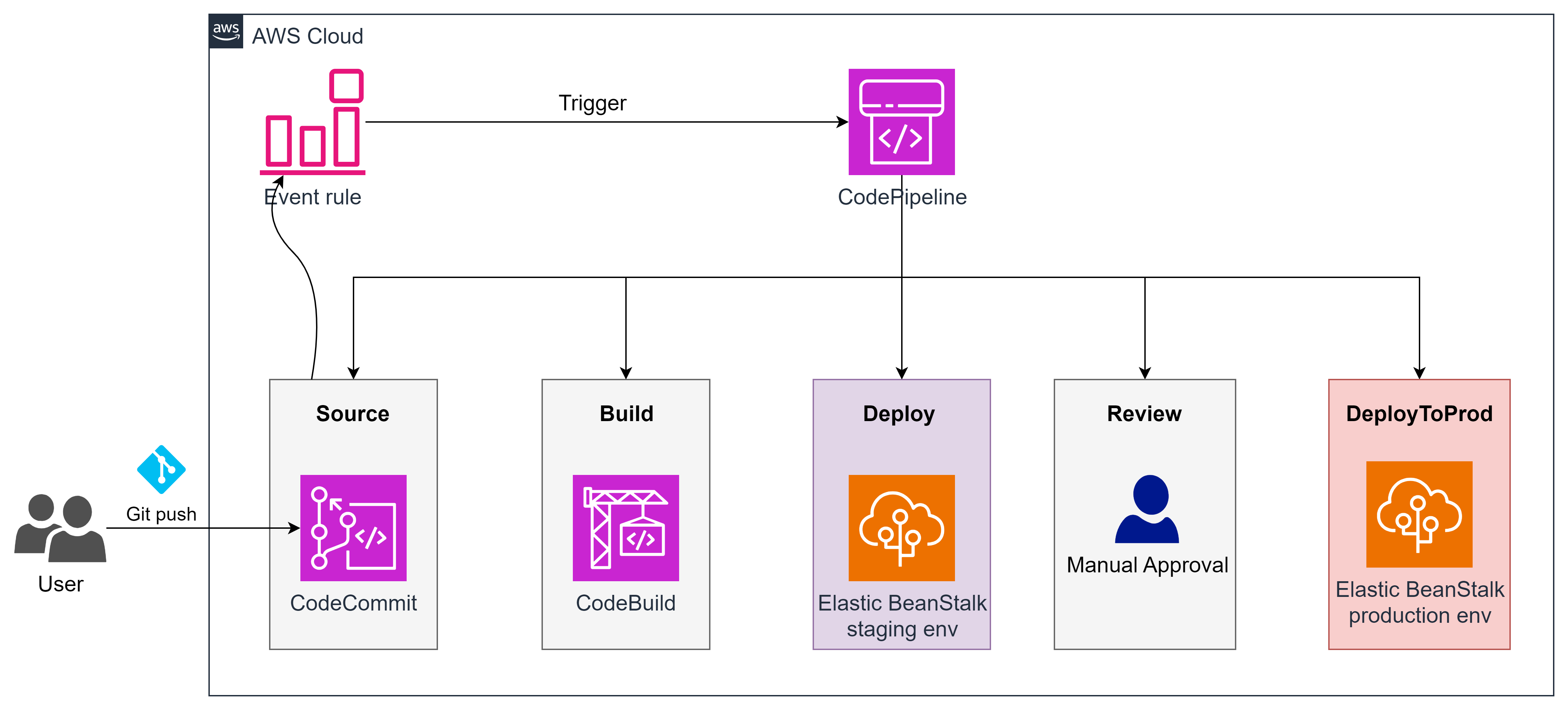 - Services used: Elastic Beanstalk, CodeCommit CodeBuild, Code Pipeline