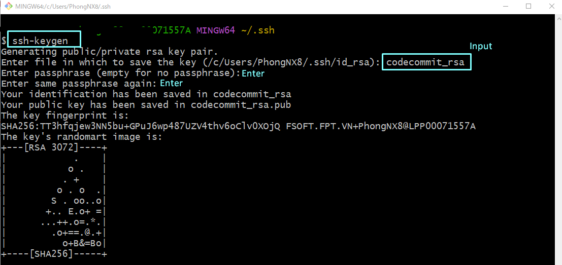 Open git bash tại thư mục C:\Users\{UserName}\.ssh để thực hiện command: ssh-keygen
