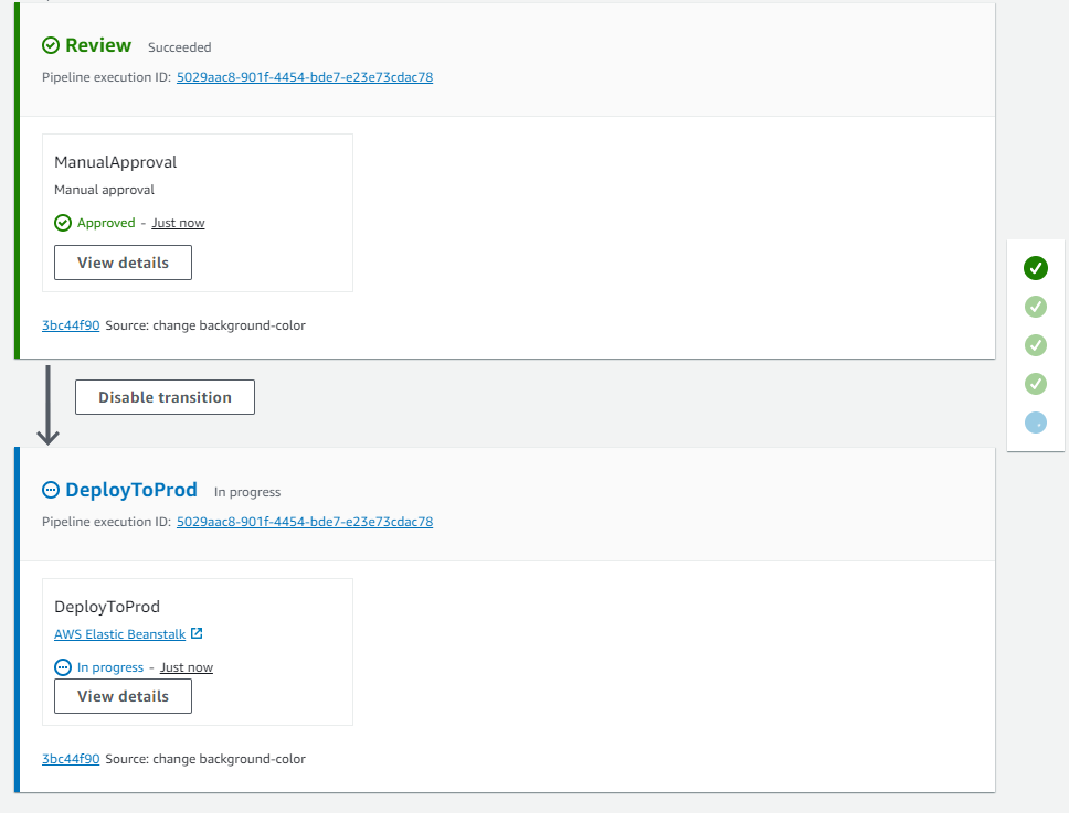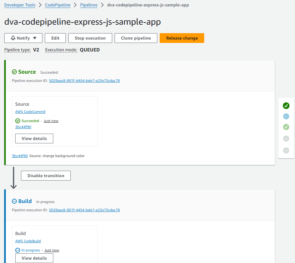 CodePipeline đã được trigger và đang quá trình thực thi.