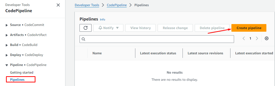Tại Console CodePipeline -> Pipelines -> Create pipeline