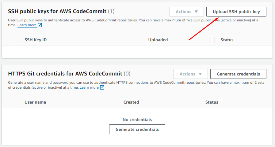 Tại tab Security credentials -> Kéo xuống SSH public keys for AWS CodeCommit -> Click Upload SSH public key