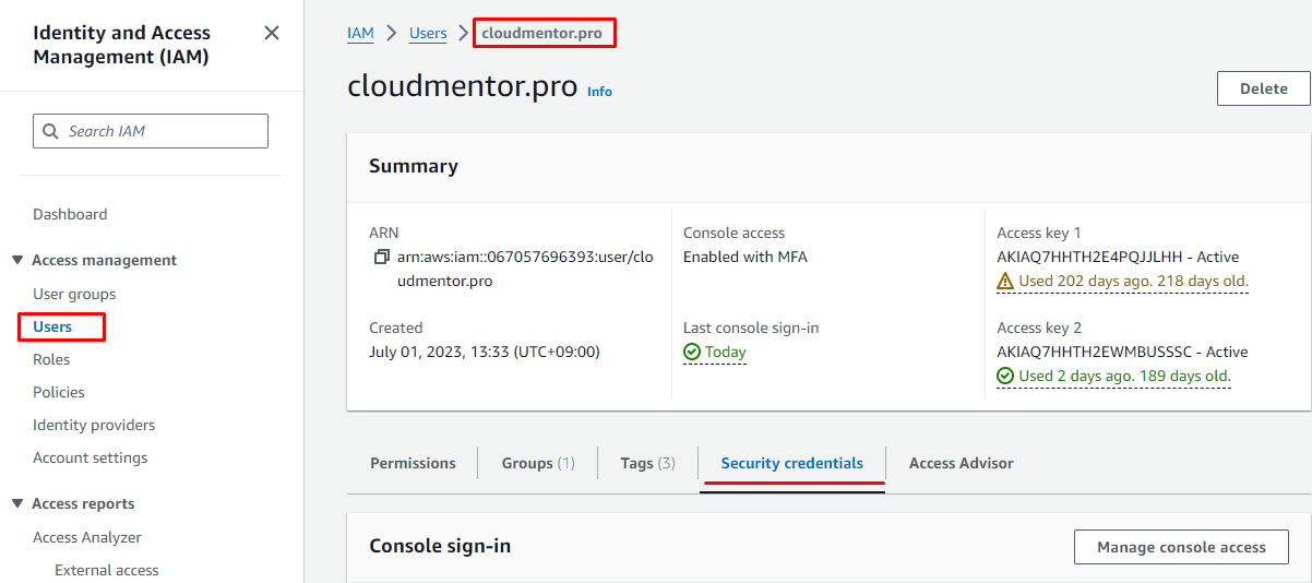 Vào Console IAM, chọn Users -> chọn IAM user của bạn.