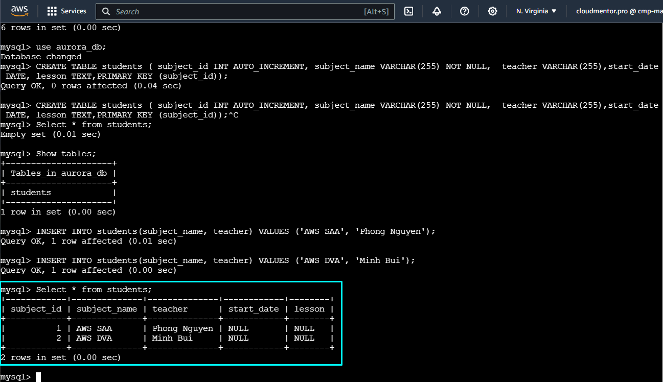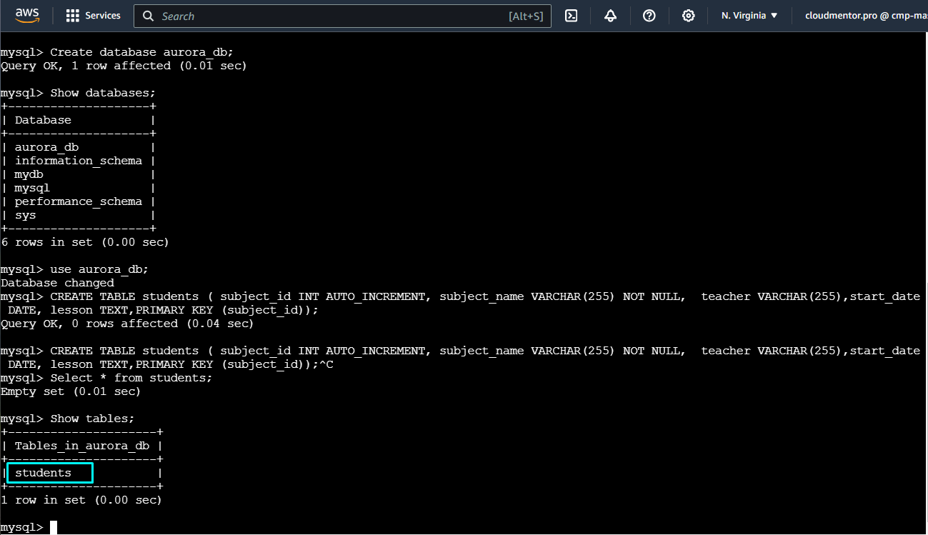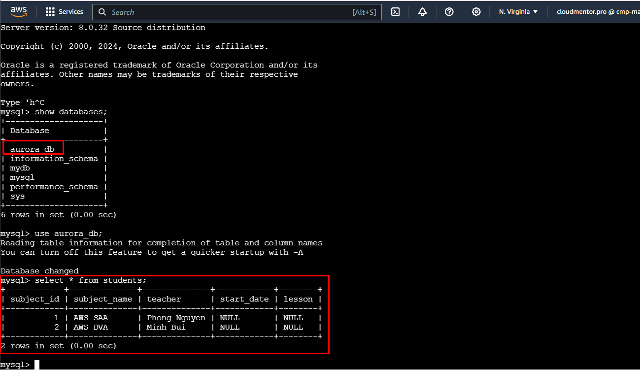 show databases;use aurora_db;select * from students;