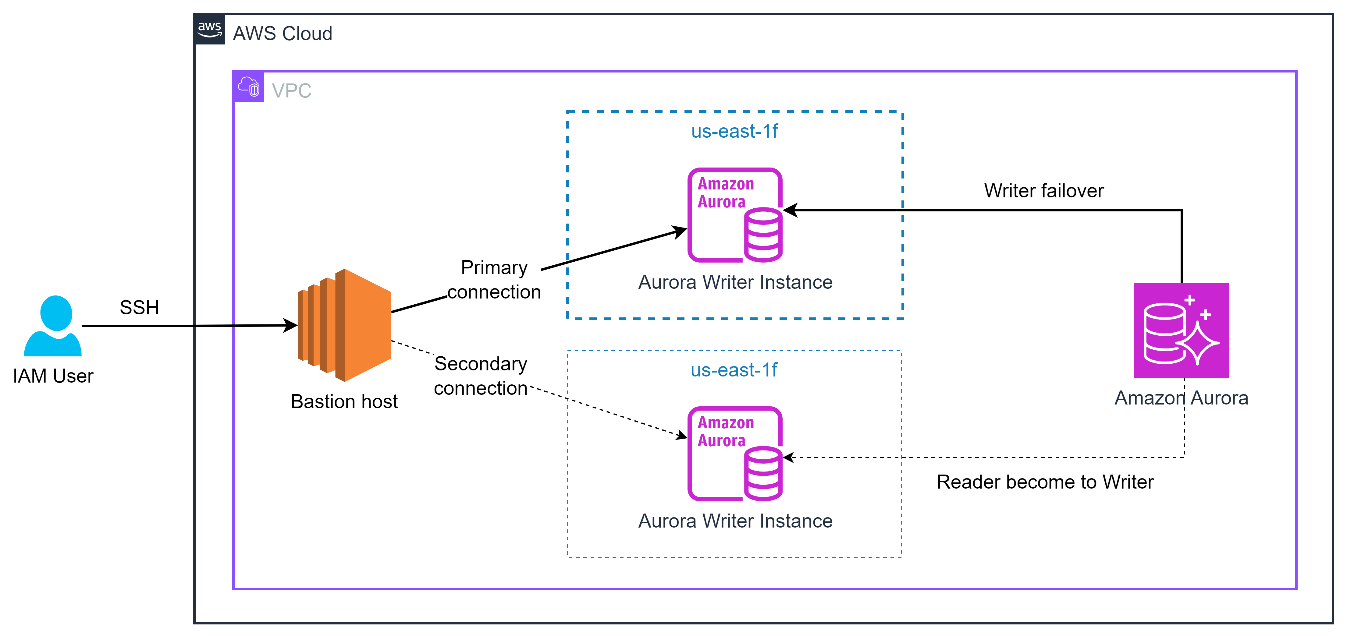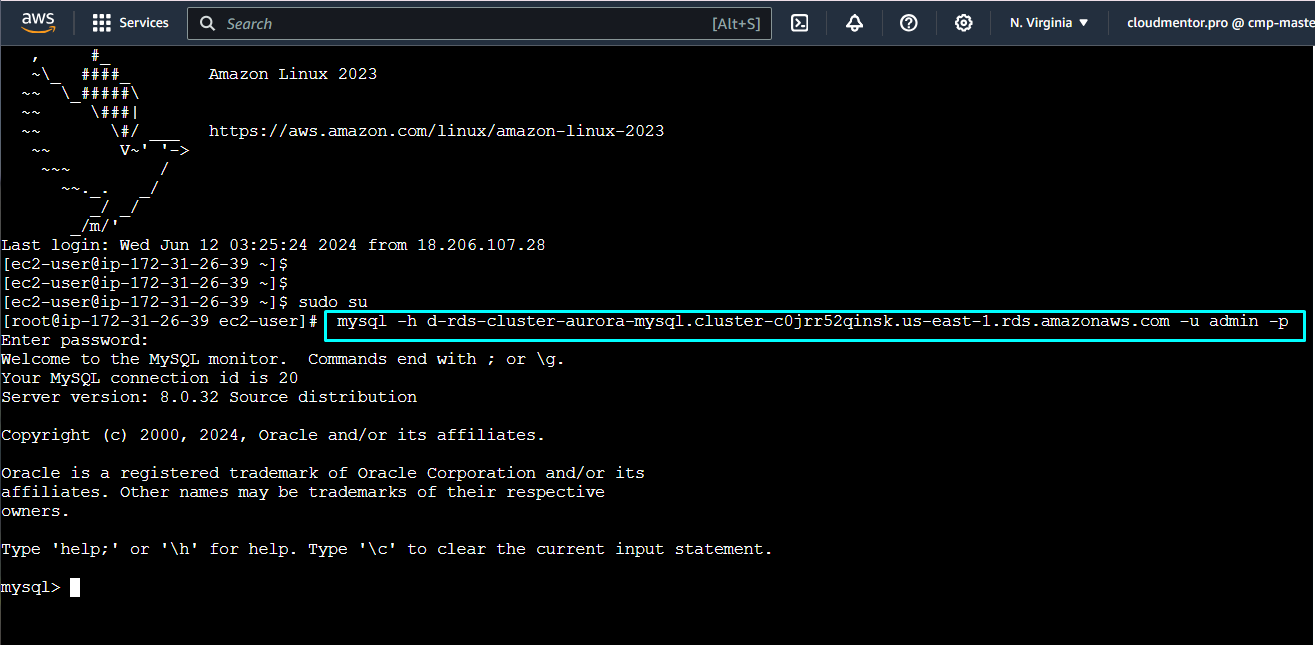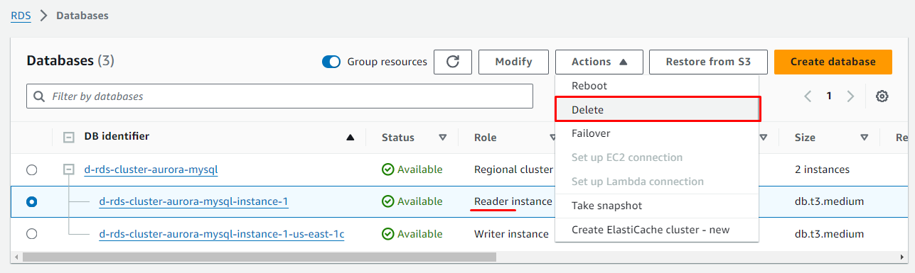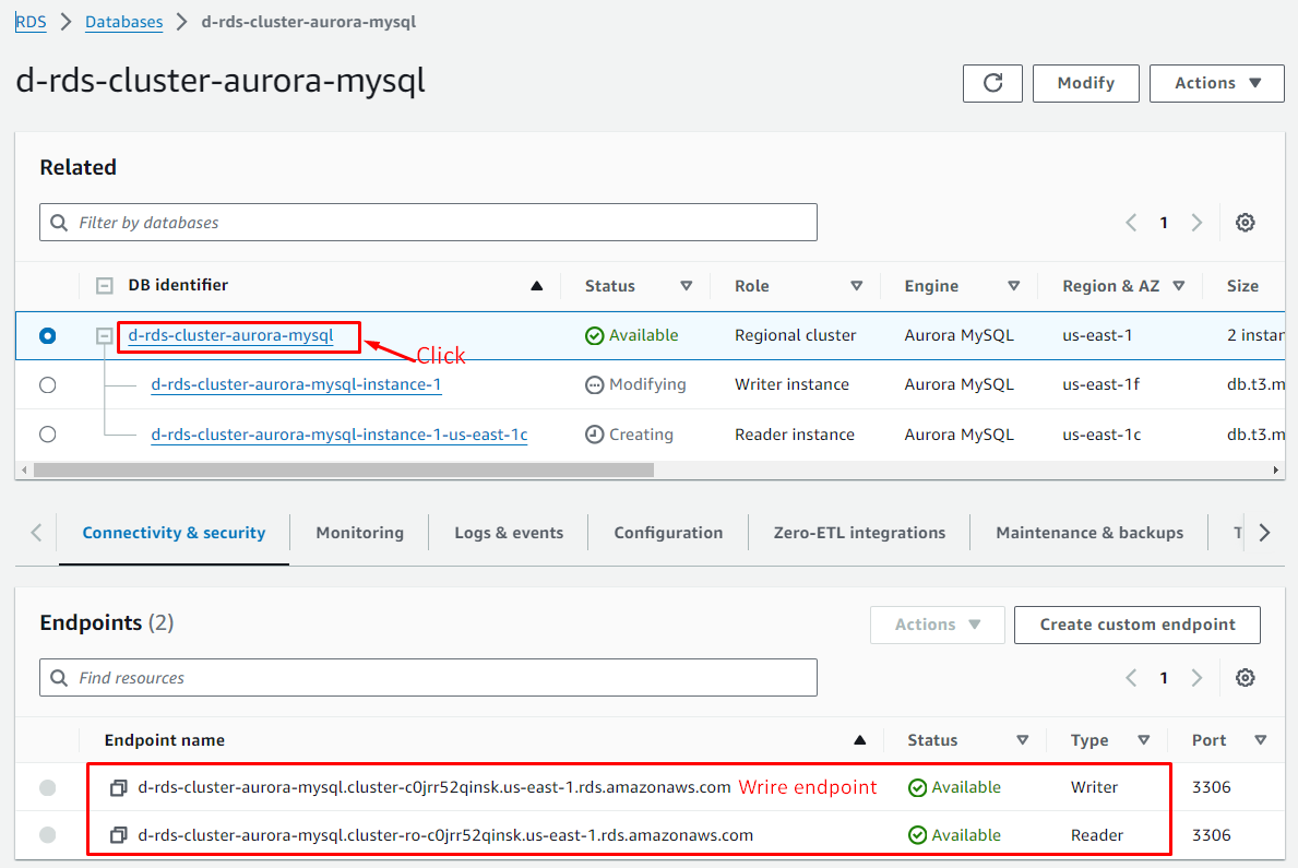 Master (Writer): d-rds-cluster-aurora-mysql.cluster-c0jrr52qinsk.us-east-1.rds.amazonaws.com
