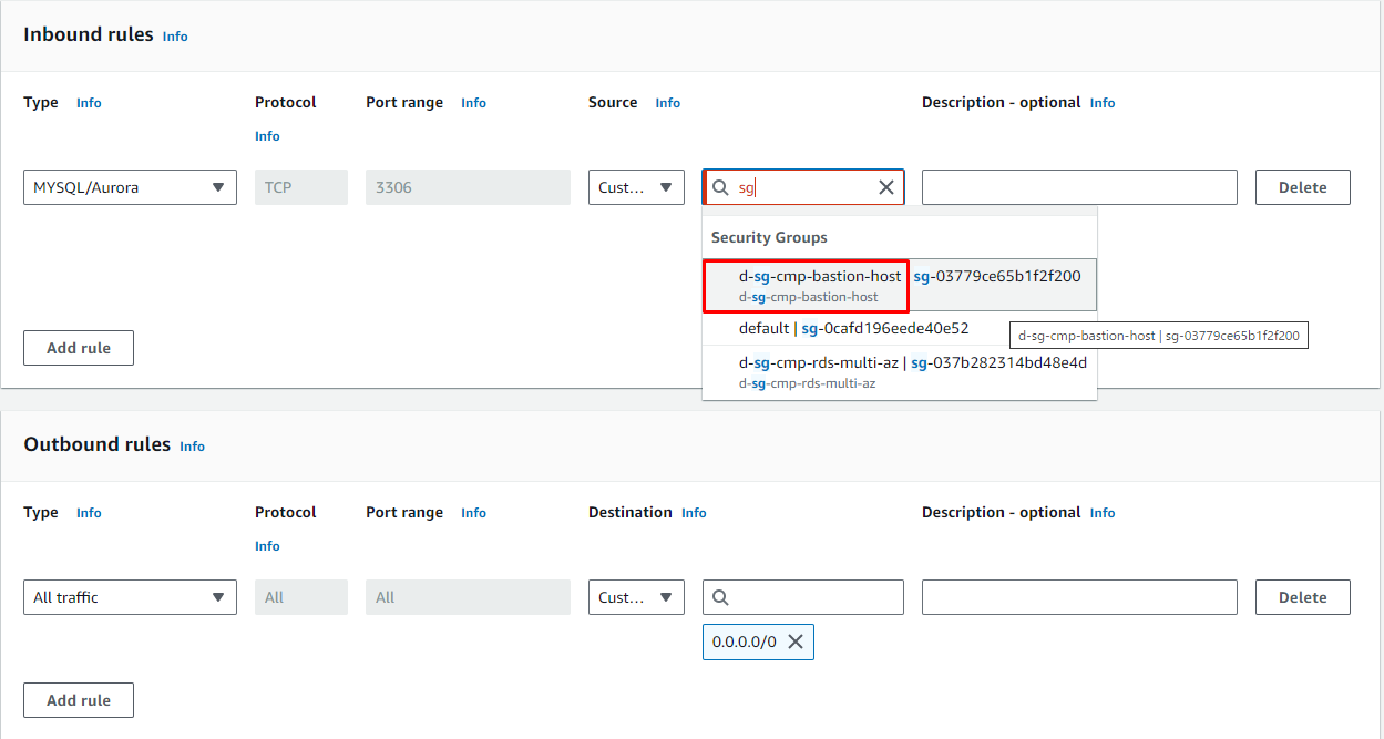 Type Protocol Port range Source MYSQL/Aurora TCP 3306 {d-sg-cmp-bastion-host} -