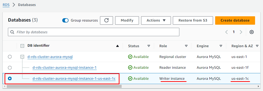 Chúng ta cũng để ý thấy rằng Write Instance đang ở AZ us-east-1f còn Reader instance đang ở us-east-1c