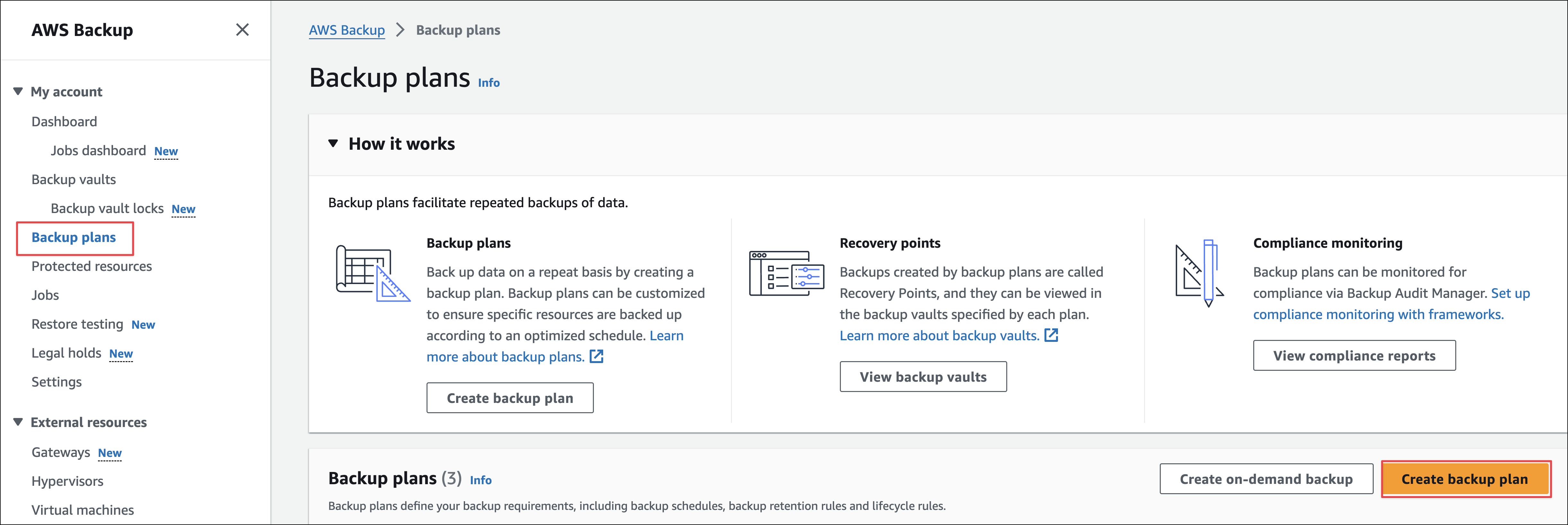 Từ Backup console, chọn Backup plans > Create backup plan