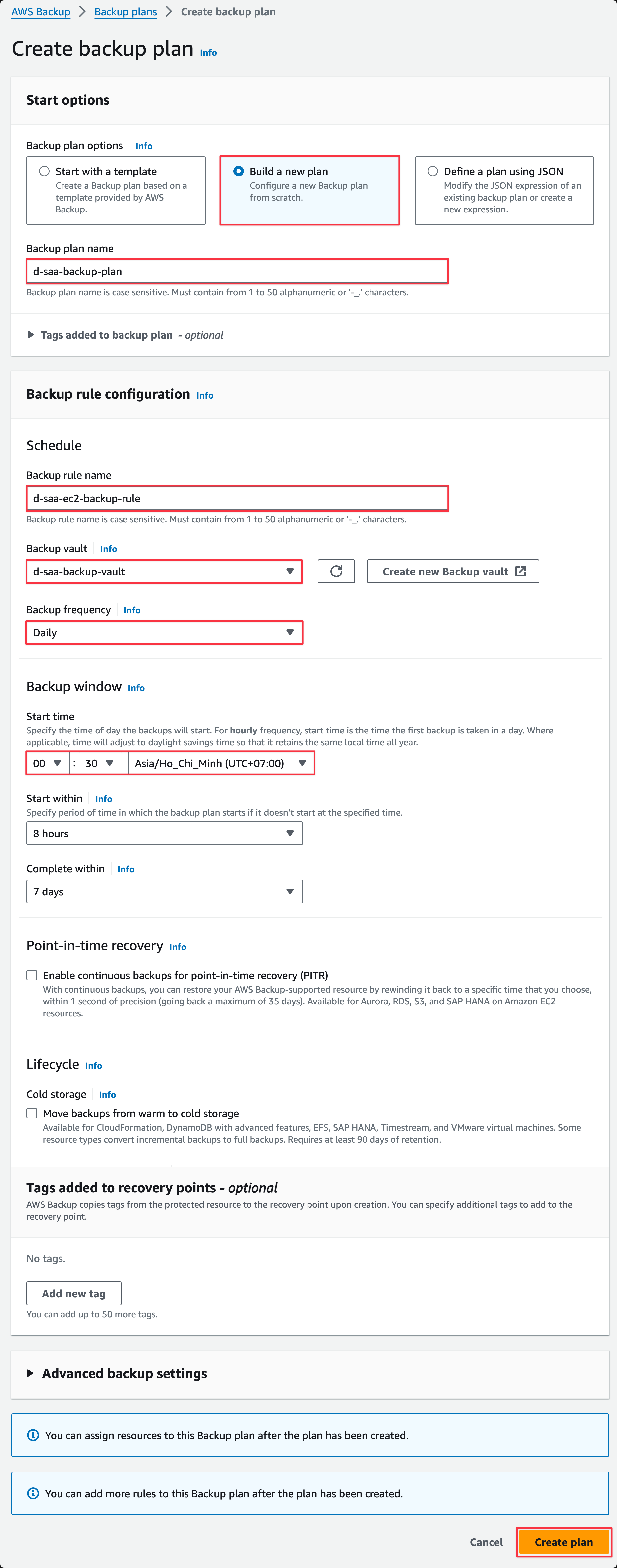 Build a new plan - Backup plan name:
