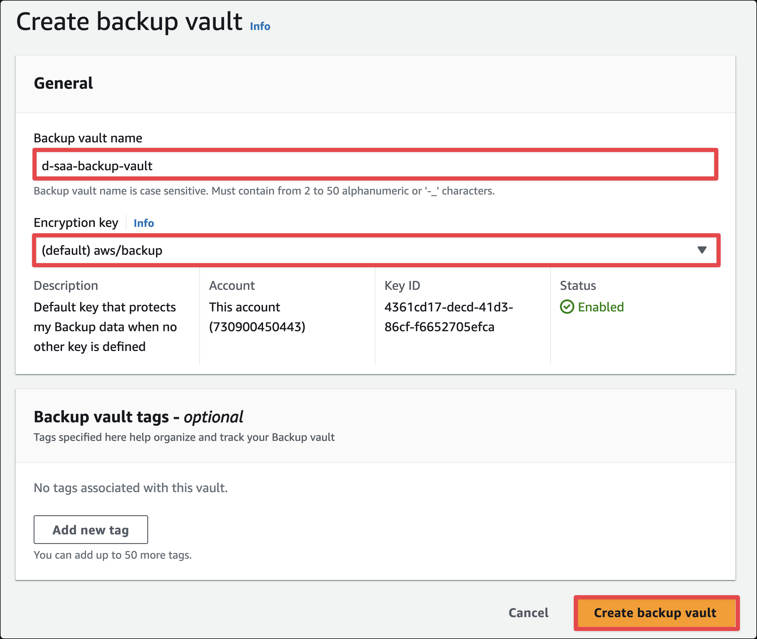 Nhập tên backup vault d-saa-backup-vault , chọn key mã hoá mặc định và nhấn Create backup vault
