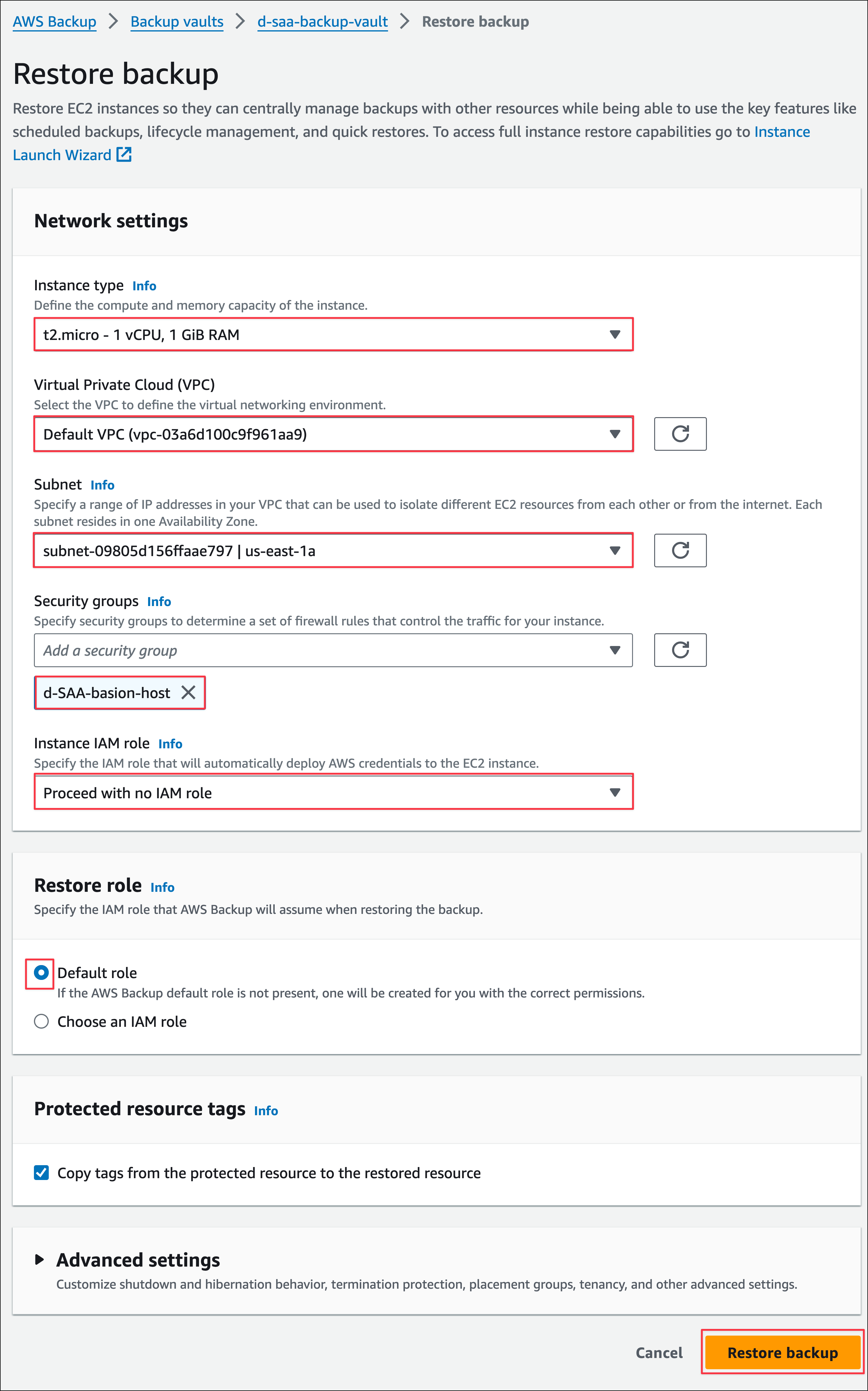 - Instance type: Default (t3.micro)