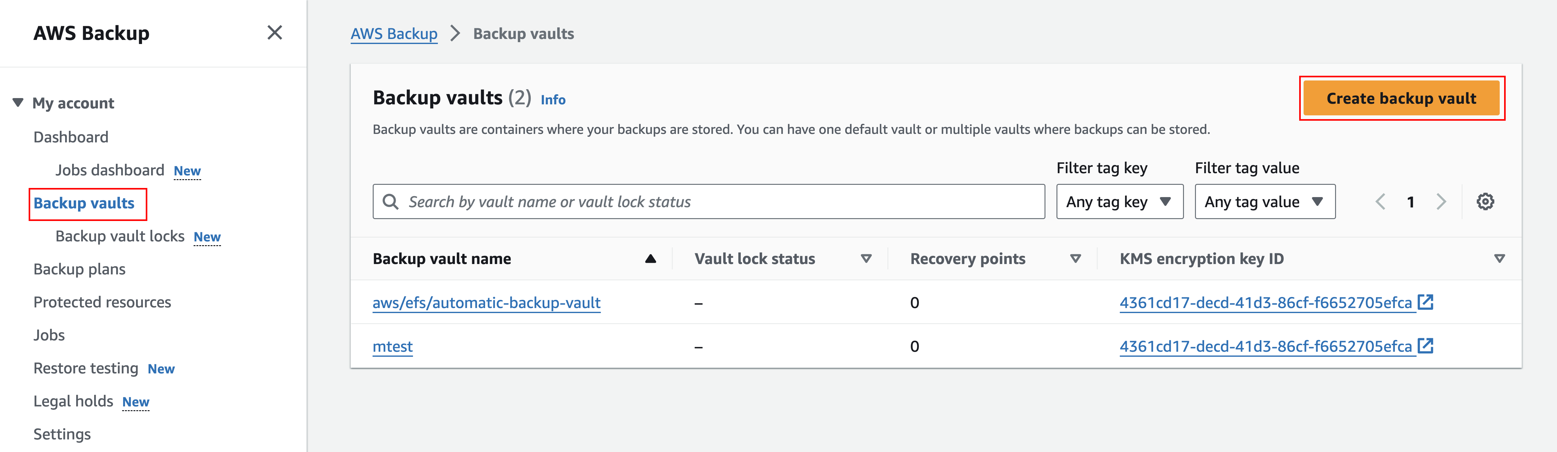 Từ AWS Backup console, chọn Backup vaults > Create backup vault
