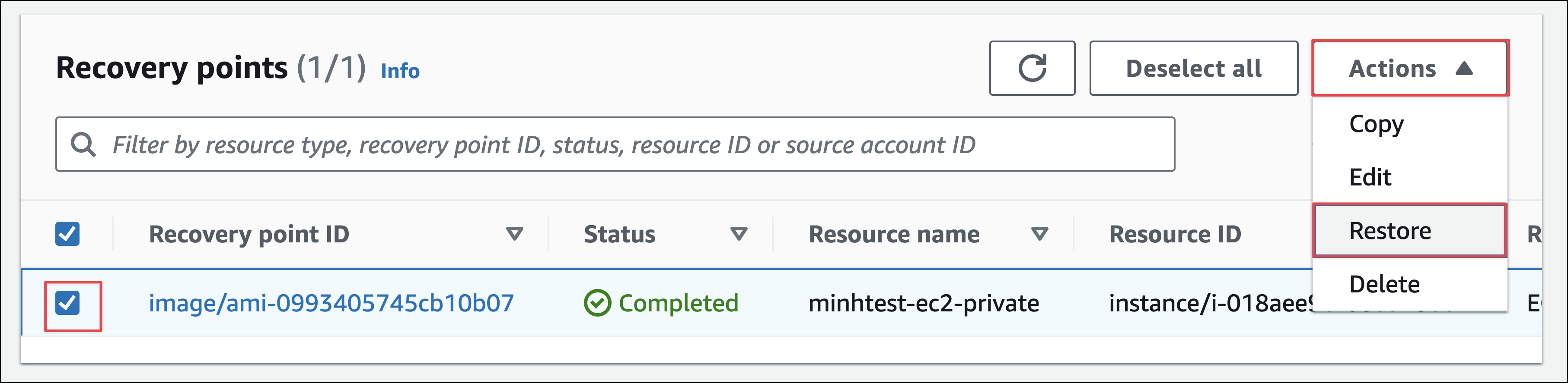 Ở màn hình Backup Vault, chọn Recovery point muốn phục hồi, nhấn Actions > Restore