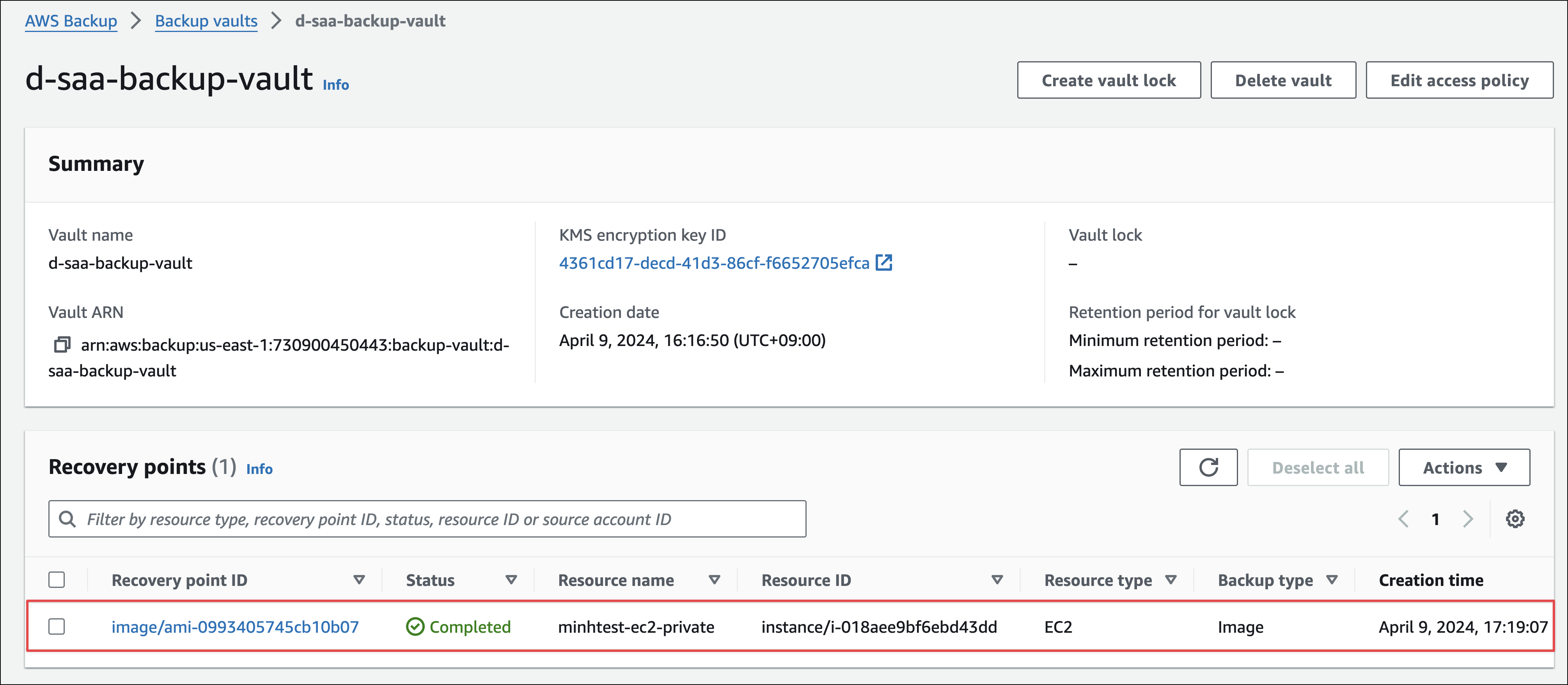 Như vậy là mình đã tạo xong Backup plan, bây giờ chỉ cần chờ một hôm đợi đến lịch là AWS Backup sẽ tự động lấy backup. Backup sau khi được lấy sẽ được lưu vào vault, mỗi bản backup tại một thời điểm được gọi là Recovery Points, có thể confirm trên console như sau: