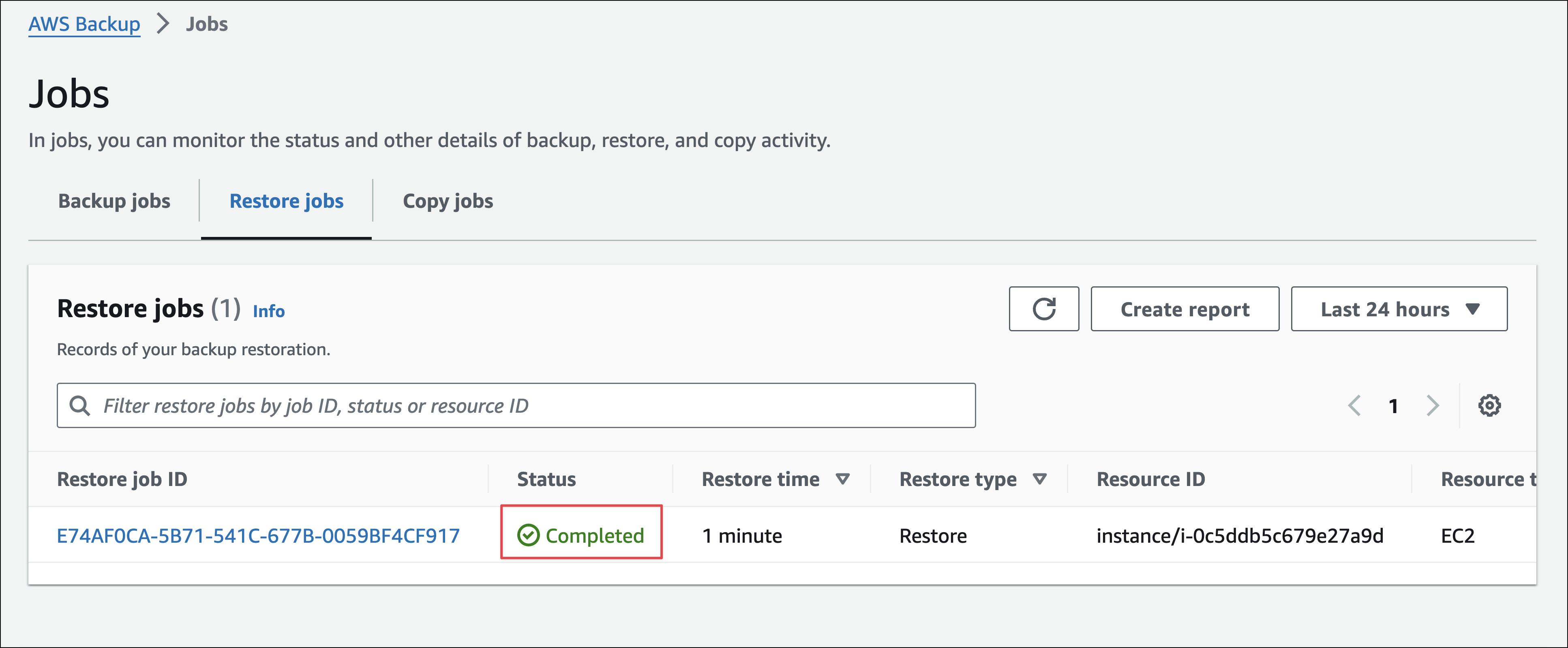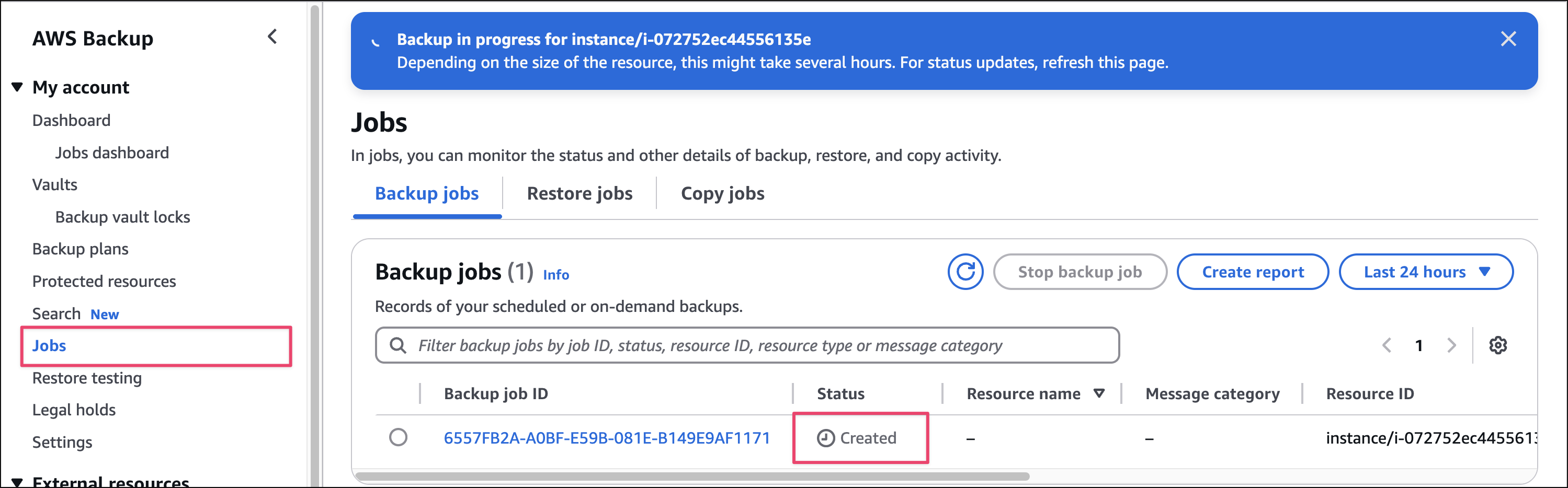 Có thể xem quá trình lấy backup ở tab Jobs, như hình dưới thì backup đang được khởi tạo với status là Created. Đợi một lúc backup sẽ lấy thành công, khi đó có thể restore EC2 mới từ backup này.