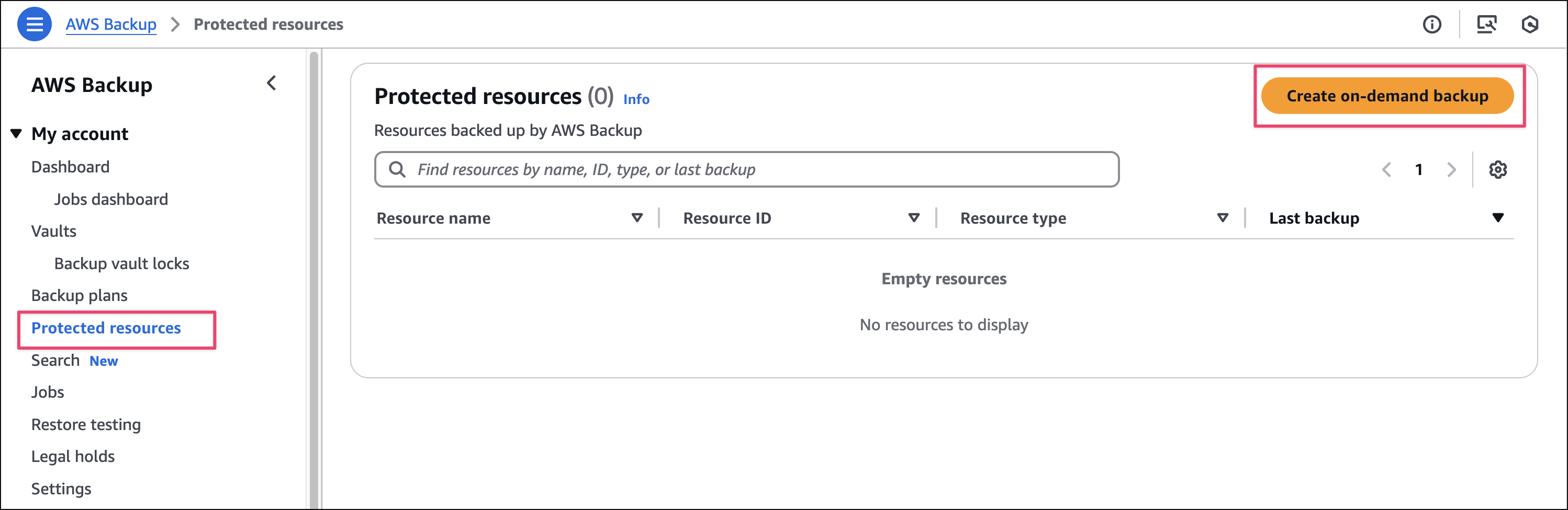 Từ console AWS Backup, chọn Protected Resources > Create on-demand backup