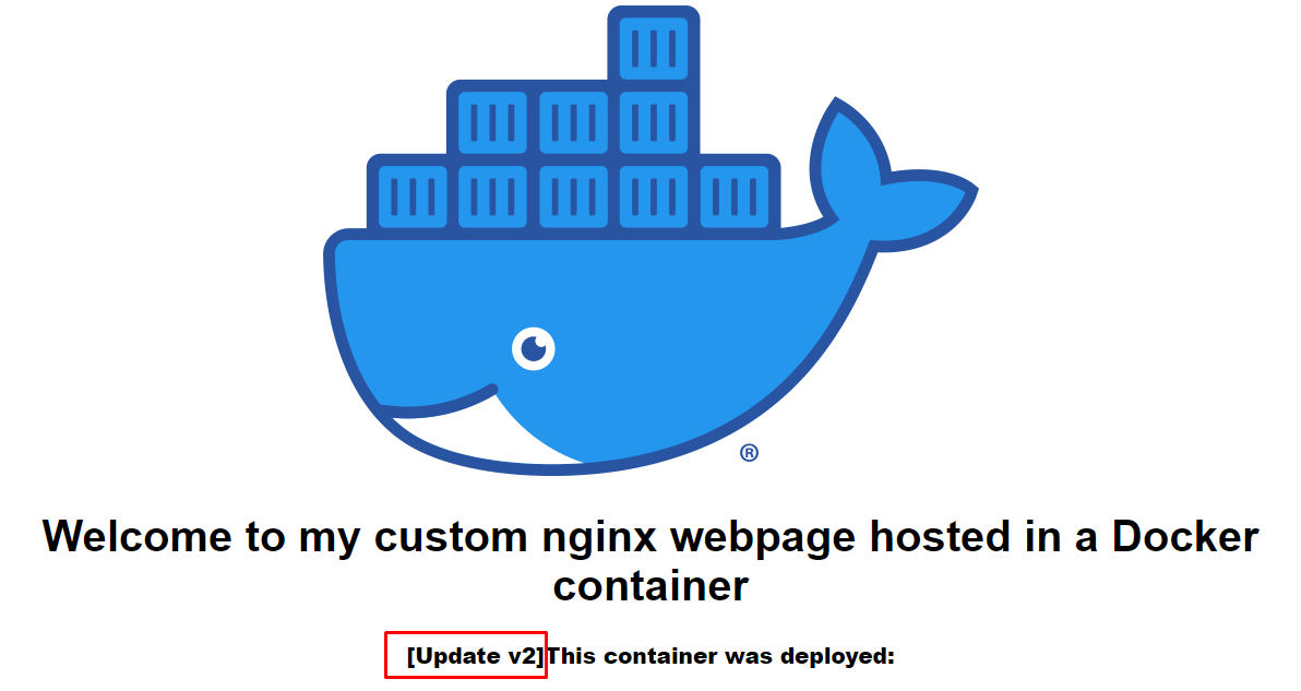 index.html<!DOCTYPE html> <html> <head> <title> ECS | CloudmentorPro Blog </title> </head> <body style=text-align:center;background-color:white;font-weight:900;font-size:20px;font-family:Helvetica,Arial,sans-serif> <img src="https://www.docker.com/wp-content/uploads/2022/03/Moby-logo.png"> <h1> Welcome to my custom nginx webpage hosted in a Docker container </h1> <p> This container was deployed: <div id="date"></div></p> <script> var date = new Date(); document.getElementById("date").innerHTML=date.toLocaleString(); </script> </body> </html> -