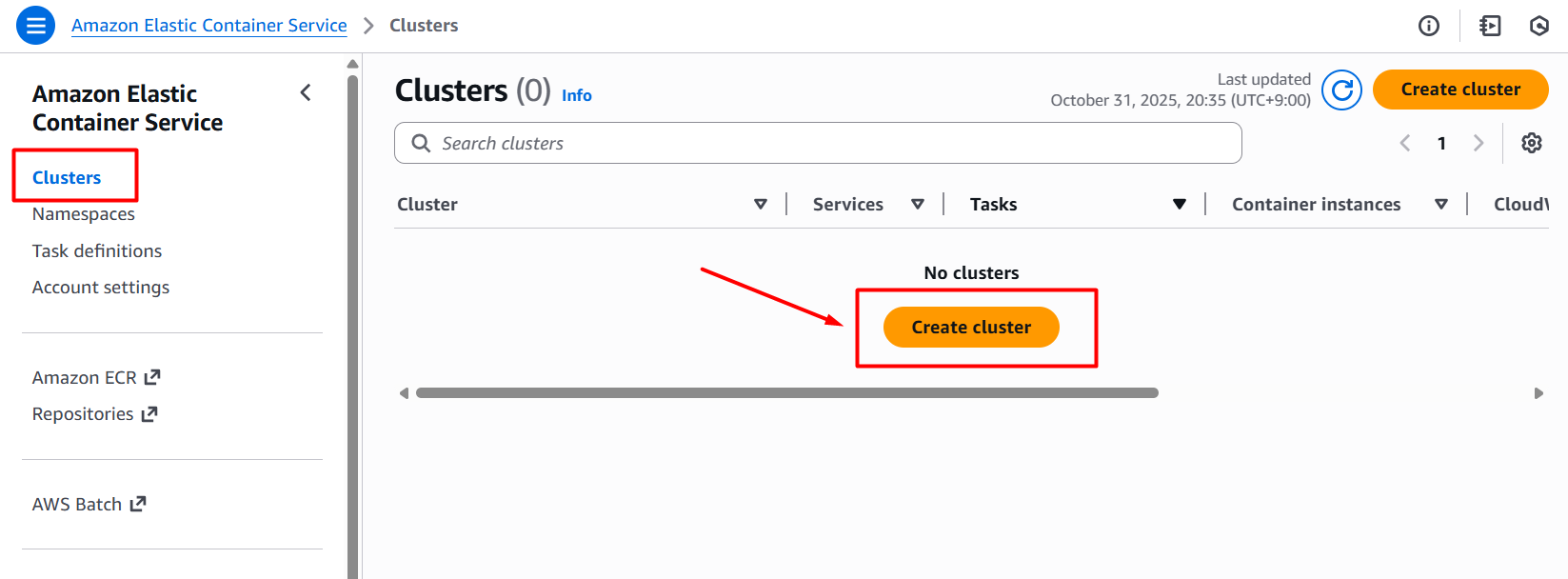 Vào Console Elastic Container Service -> Chọn Clusters -> Create cluster