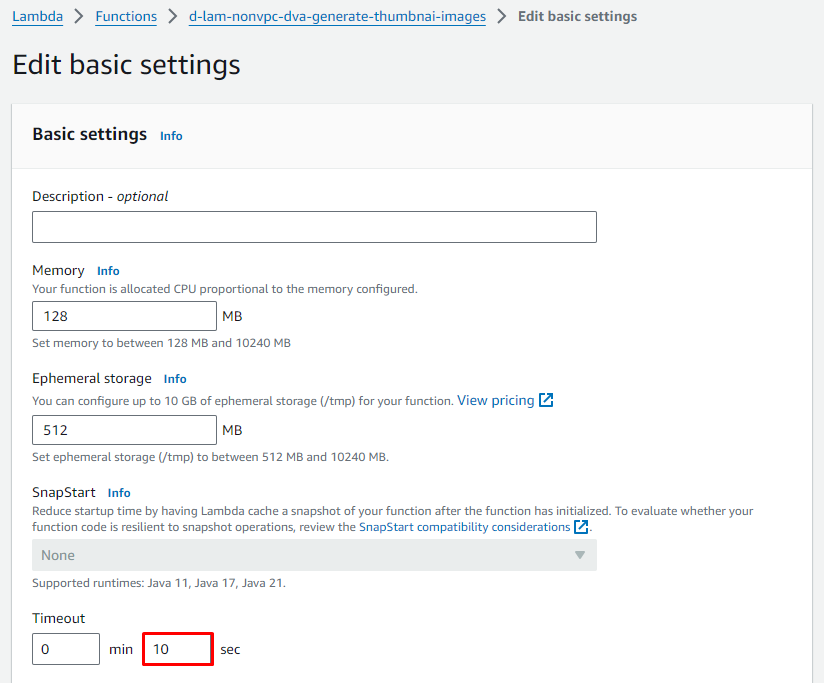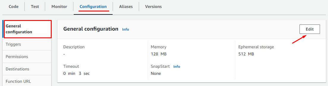Vào Configuration của Lambda -> General configuration -> Click Edit