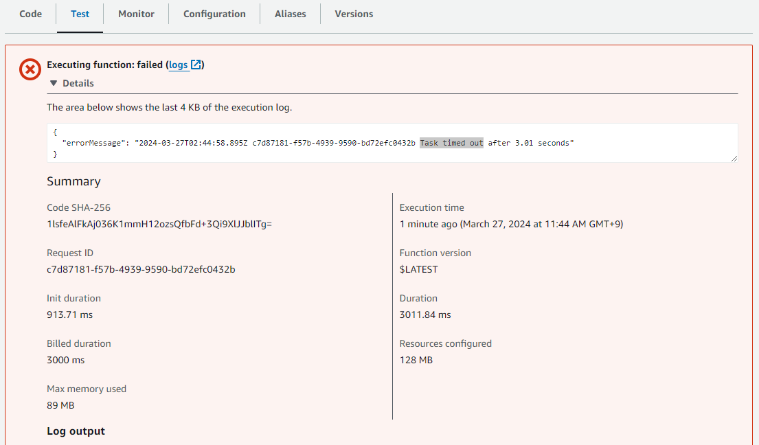 Nếu bạn gặp lỗi Task timed out như bên dưới, thì lý do là Lambda đang default 3s, mình cần tăng số này lên.