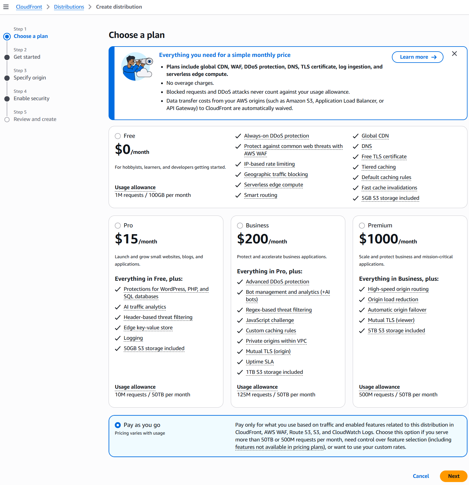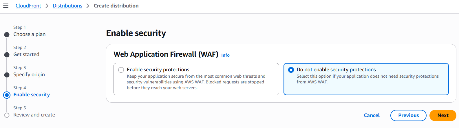 - Settings: để default ( sẽ tự tạo bucket policy chỉ cho phép access từ Cloudfront → rất security)