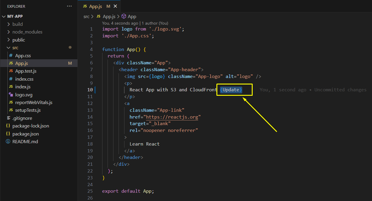 Update file src\App.js nếu bạn muốn Custom. Ví dụ như mình sẽ thay đổi dòng bên dưới