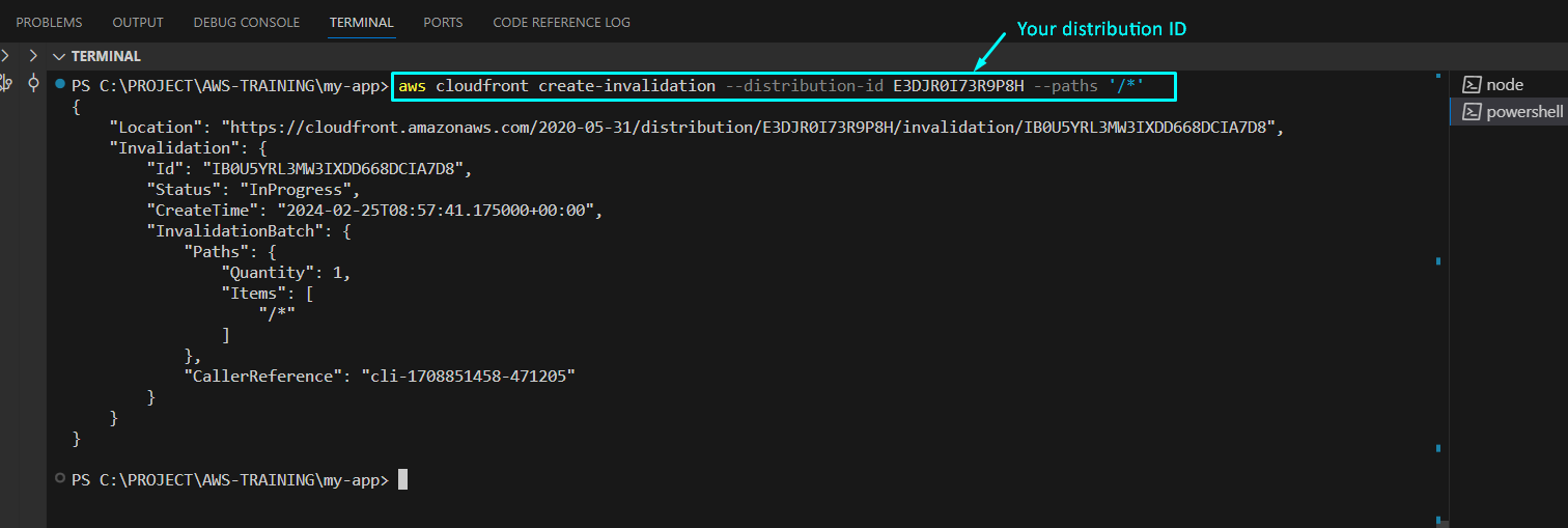 aws cloudfront create-invalidation --distribution-id YOUR_DISTRIBUTION_ID --paths '/*'