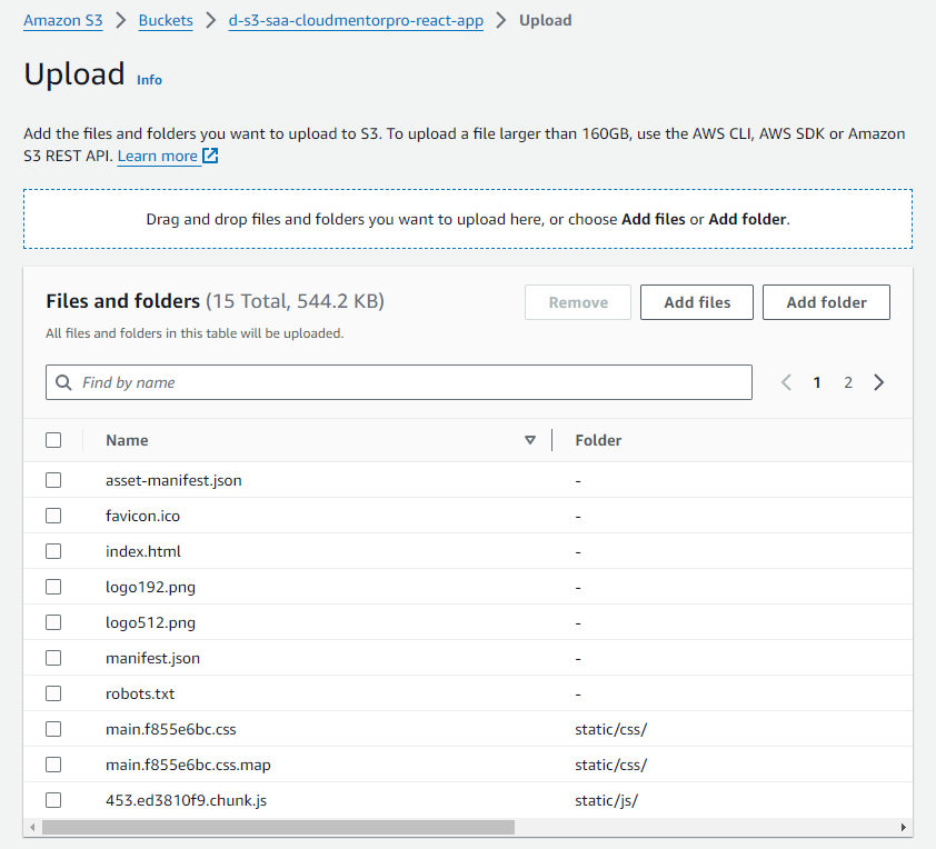 Upload toàn bộ nội dung trong thư mục build vào S3 bucket (dùng kéo thả)