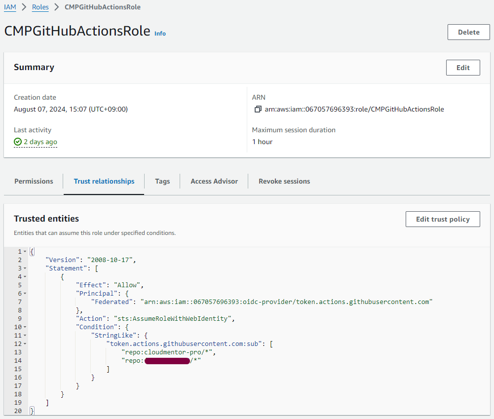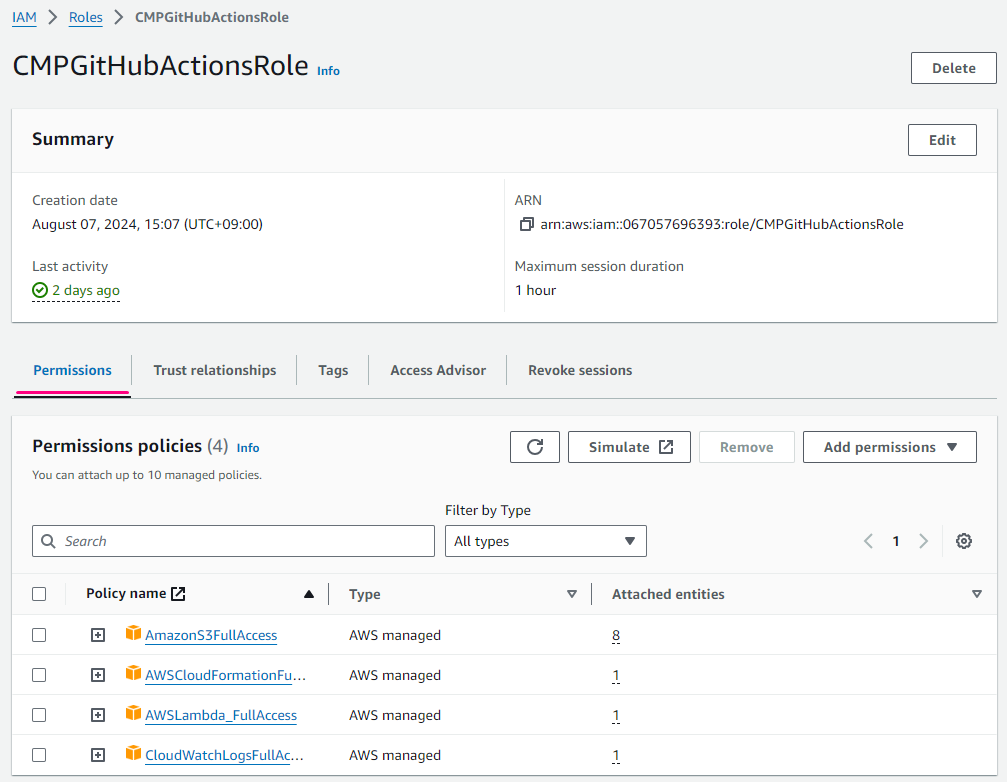 CMPGitHubActionsRole - Permissions policies (Bài demo bên dưới mình sẽ sử dụng các policy sau)