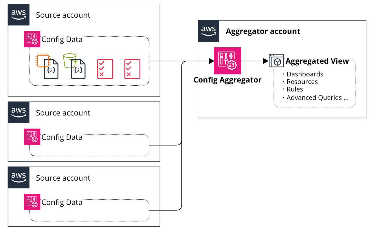 Về implementation, Config data từ mỗi "source account" được replicate đến "aggregator account". Trên aggregator account có thể xem aggregated view dạng read-only.