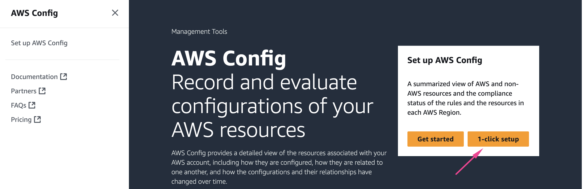 Vào AWS Config Console -> chọn 1-click-setup (các thông tin set up sẽ được giải thích sau)