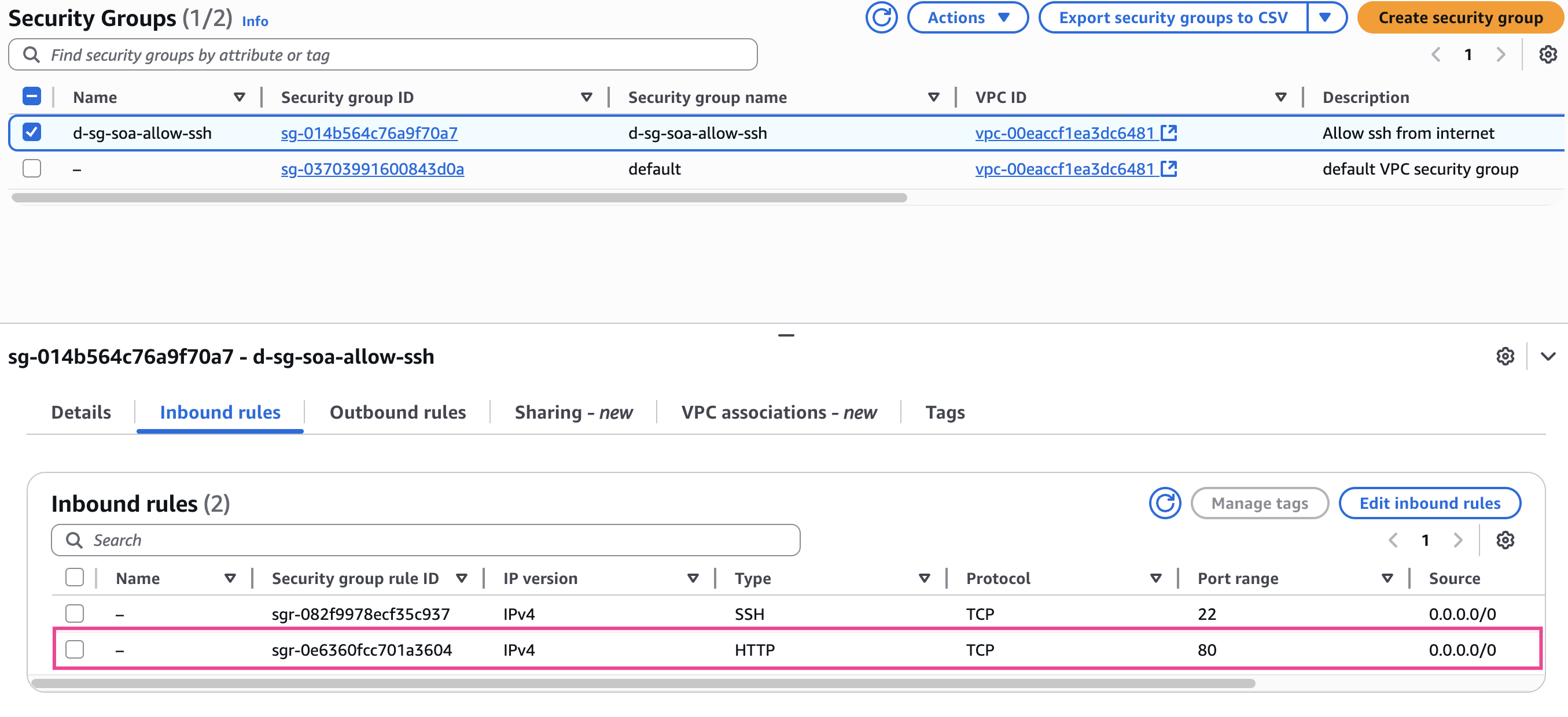d-sg-soa-allow-ssh - Tạo Security group KHÔNG có Inbound rule cho phép SSH from Internet: