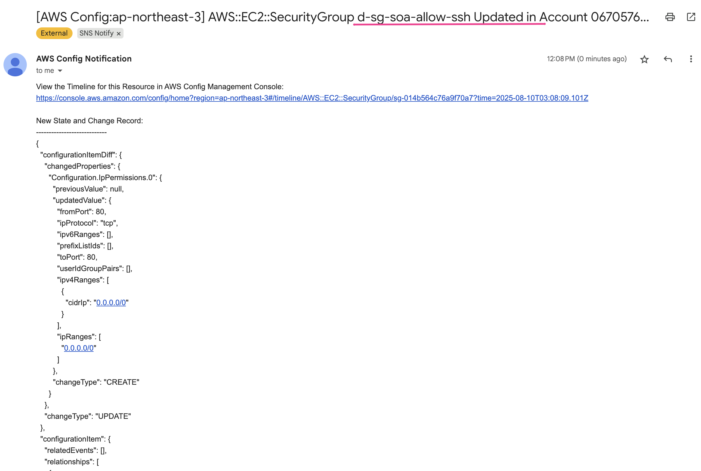 AWS Config kết hợp với SNS topic. Ví dụ khi resource được update, có thể gửi notification đến email address cụ thể.