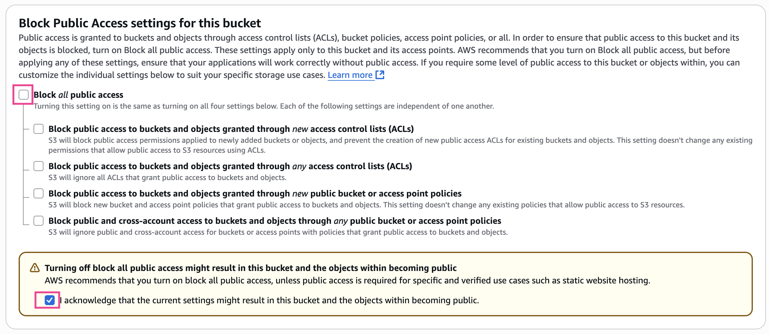 d-s3-soa-{Account-ID}-public-access-2 - Bỏ check Block all public access