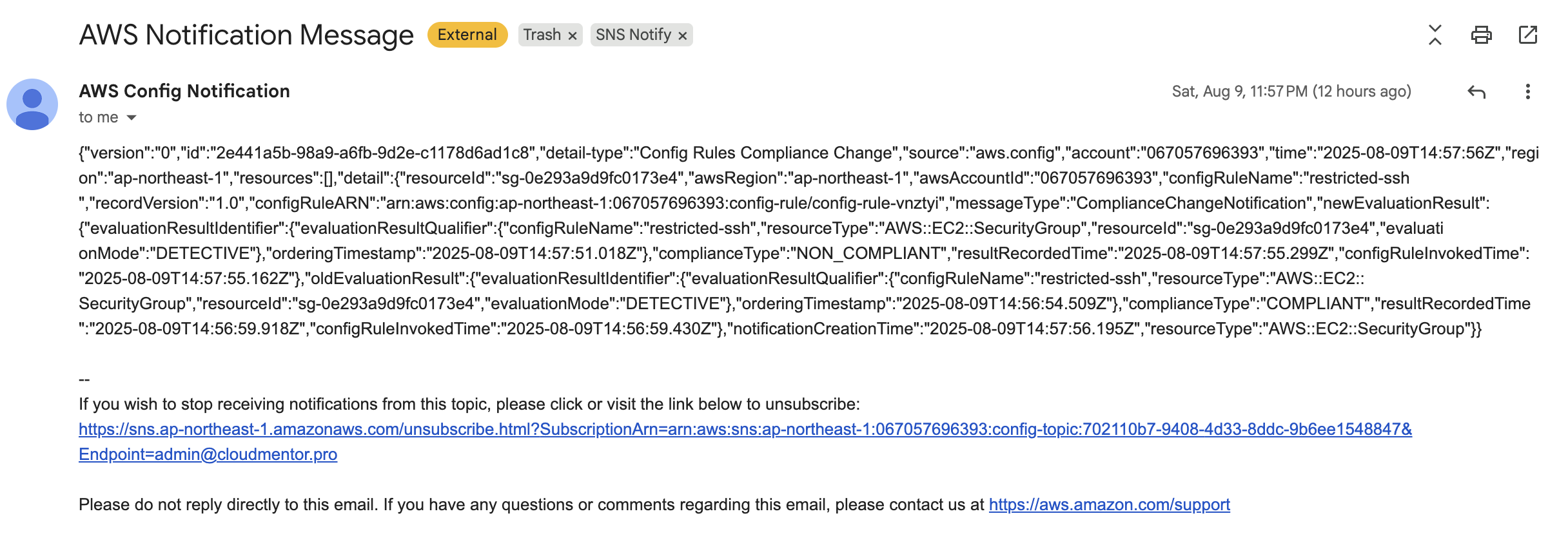 Và liên kết với SNS Topic để notification, bạn sẽ nhận email như sau: