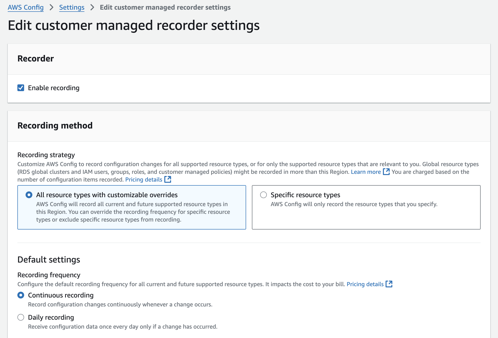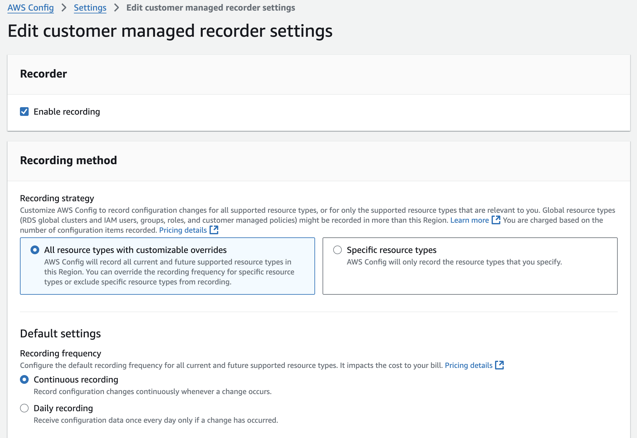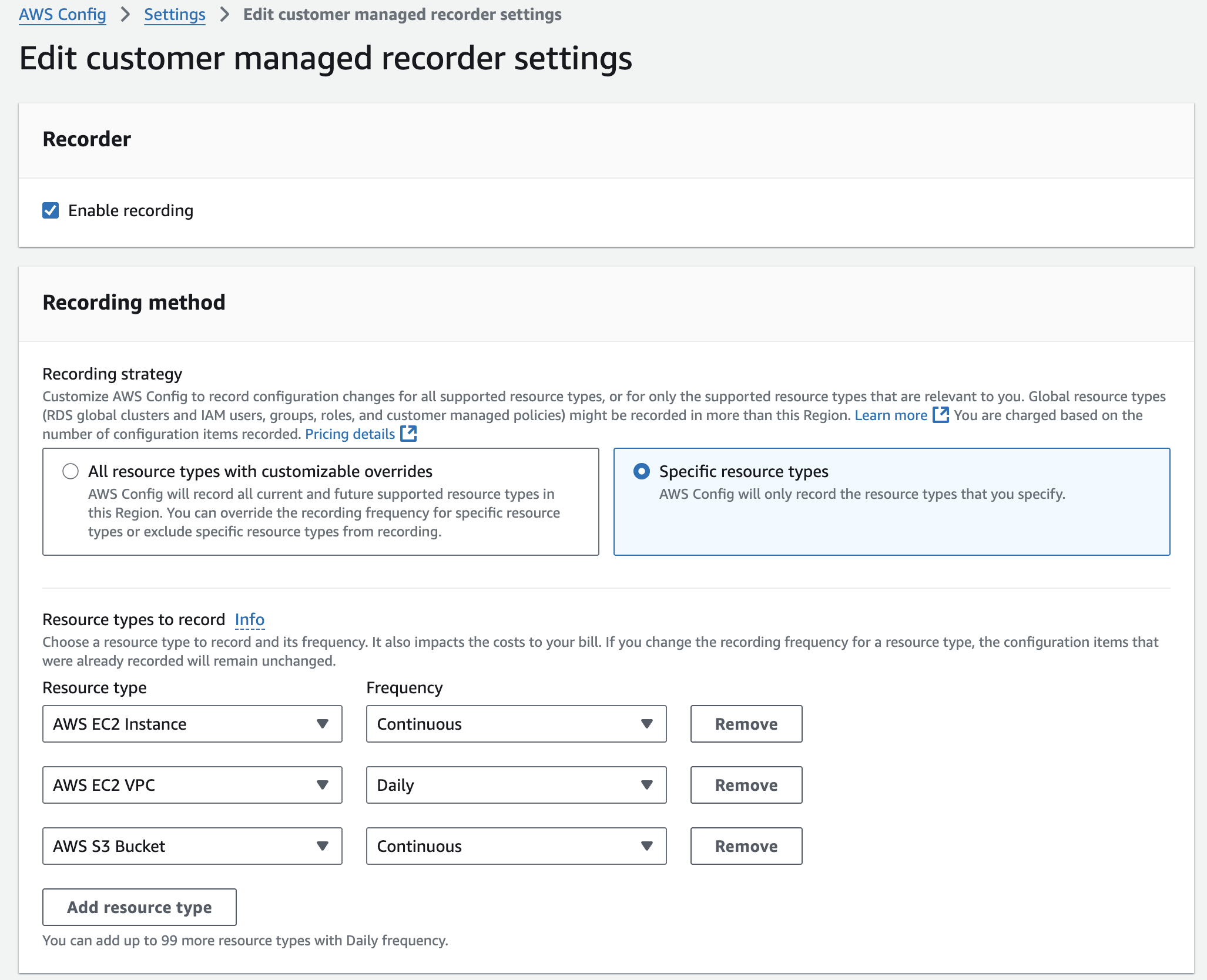 - Recording strategy cần record ("All resource types with customizable overrides" hoặc "Specific resource types")