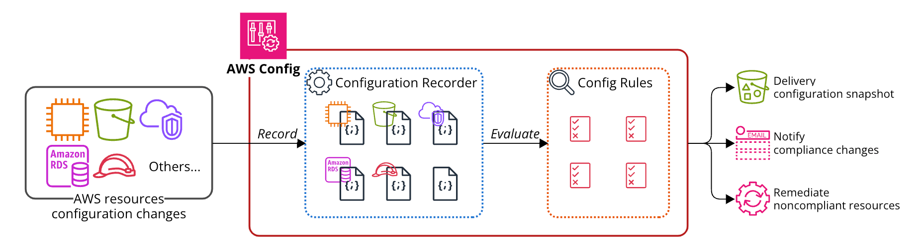 Các chức năng chính là Record (ghi lại) thông qua Configuration Recorder và Evaluate (đánh giá) thông qua Config Rules.