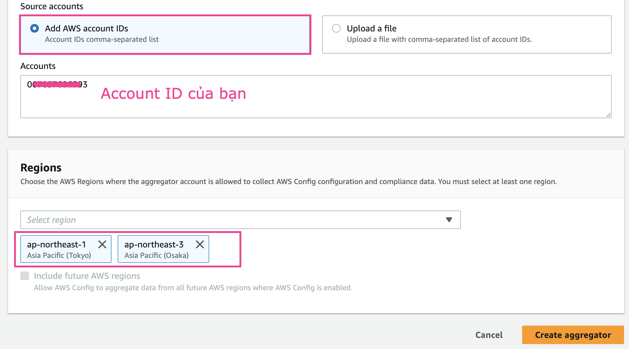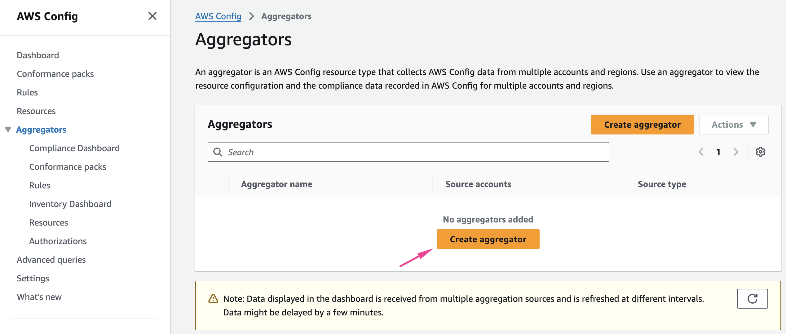 Bằng cách tạo Config Aggregator, bạn có thể tập hợp Config data (thông tin config resource và kết quả evaluation của Config Rules). Có thể tập hợp từ multi-account, multi-region.