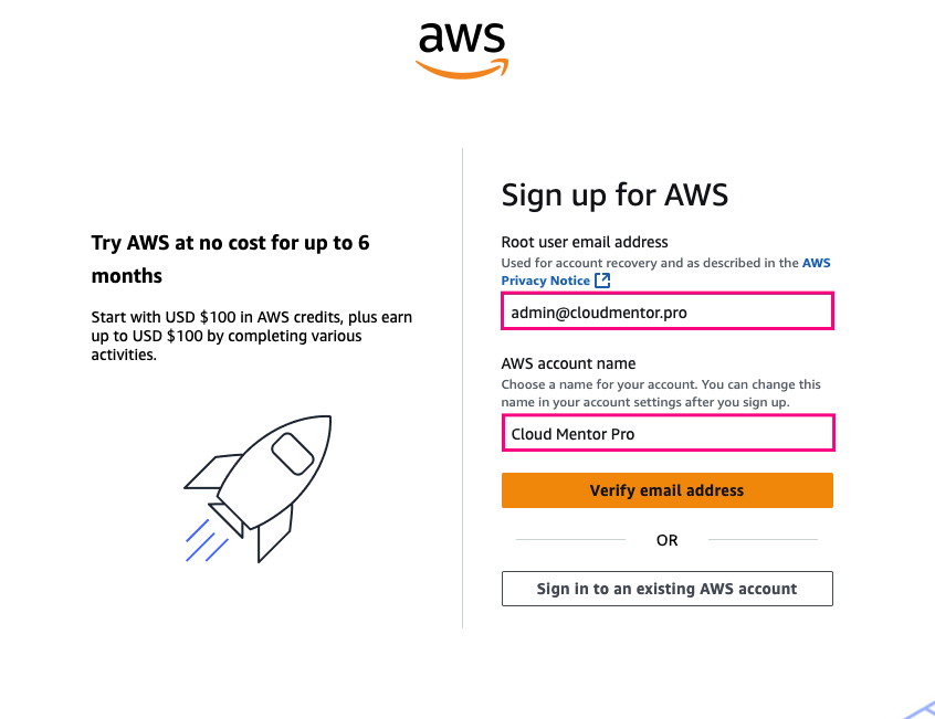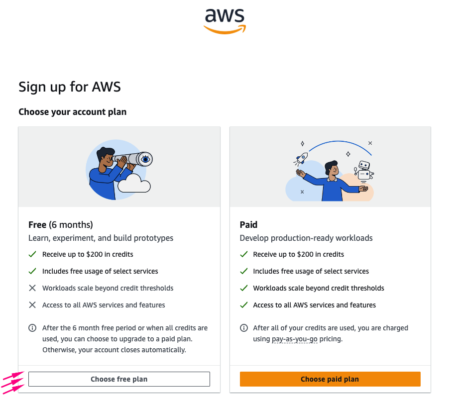 Ở bài blog này, chúng ta sẽ tiến hành đăng ký một tài khoản Free account plan. Với tài khoản này, đảm bảo bạn sẽ không phải chịu bất kỳ chi phí nào khi khám phá các dịch vụ AWS và xây dựng ứng dụng của mình. Gói tài khoản miễn phí của bạn sẽ kết thúc sau 6 tháng hoặc khi credits của bạn được sử dụng hết - tùy theo điều kiện nào xảy ra trước.