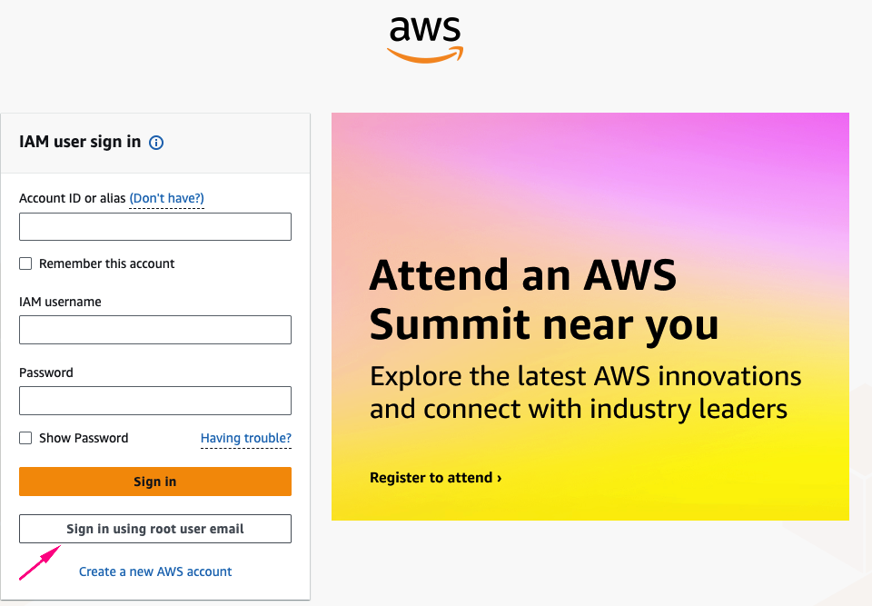 - Chọn Root user và nhập email đã dùng để đăng ký account (đây được gọi là root user - là user có quyền cao nhất của account)