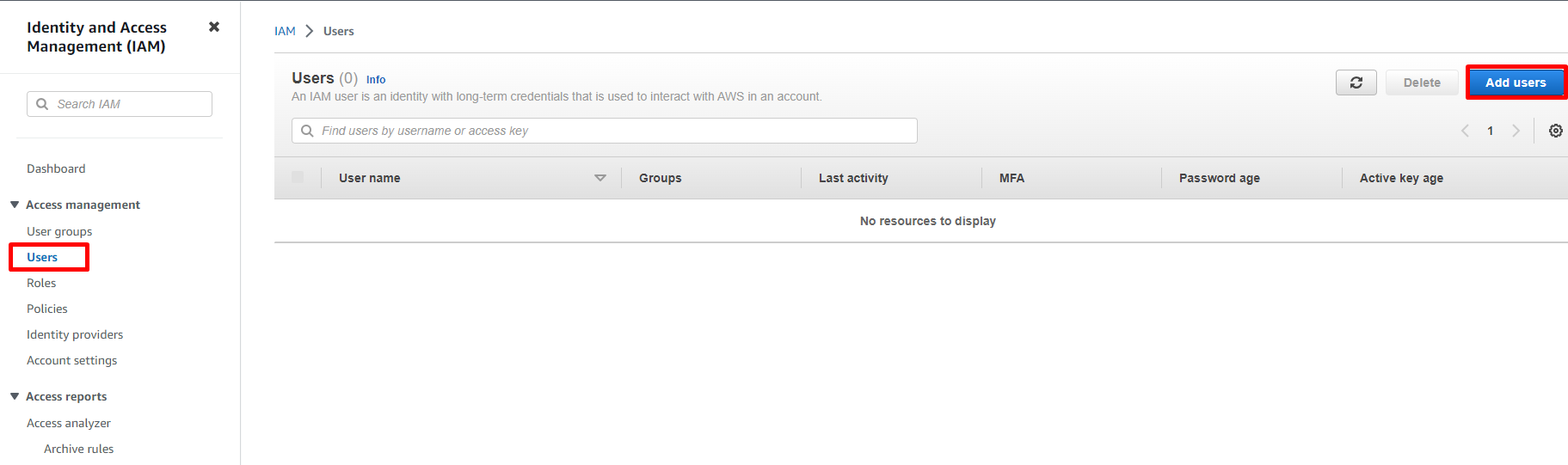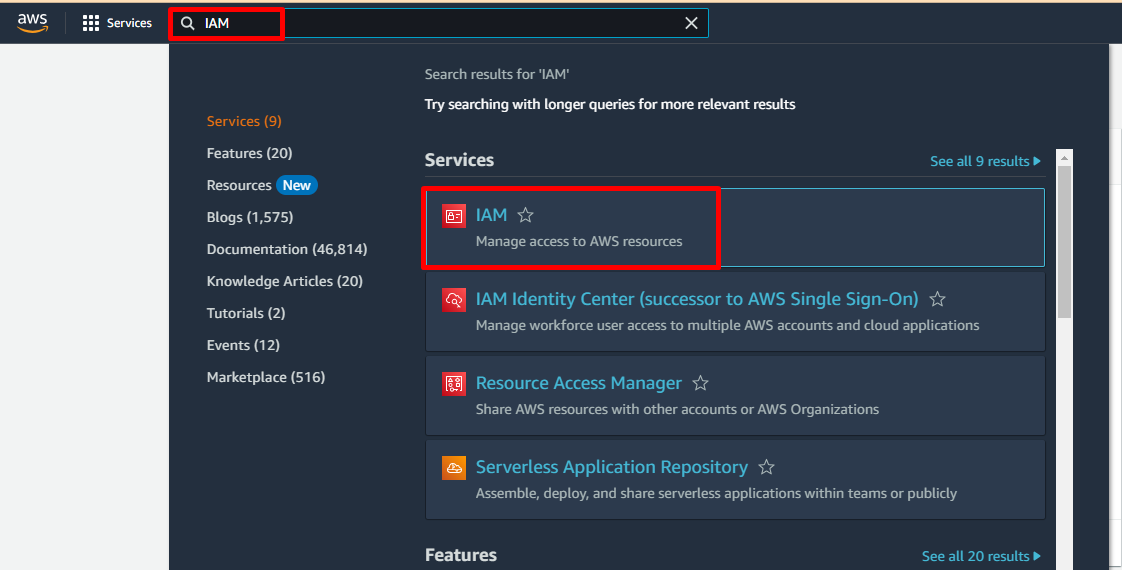 - Login bằng root user vào Console, Access đến service IAM