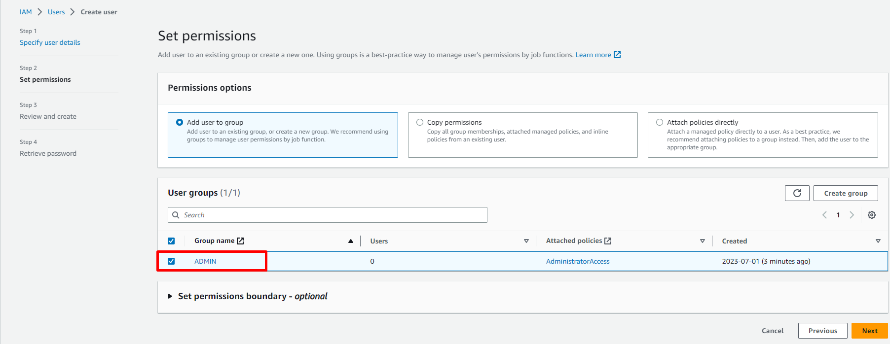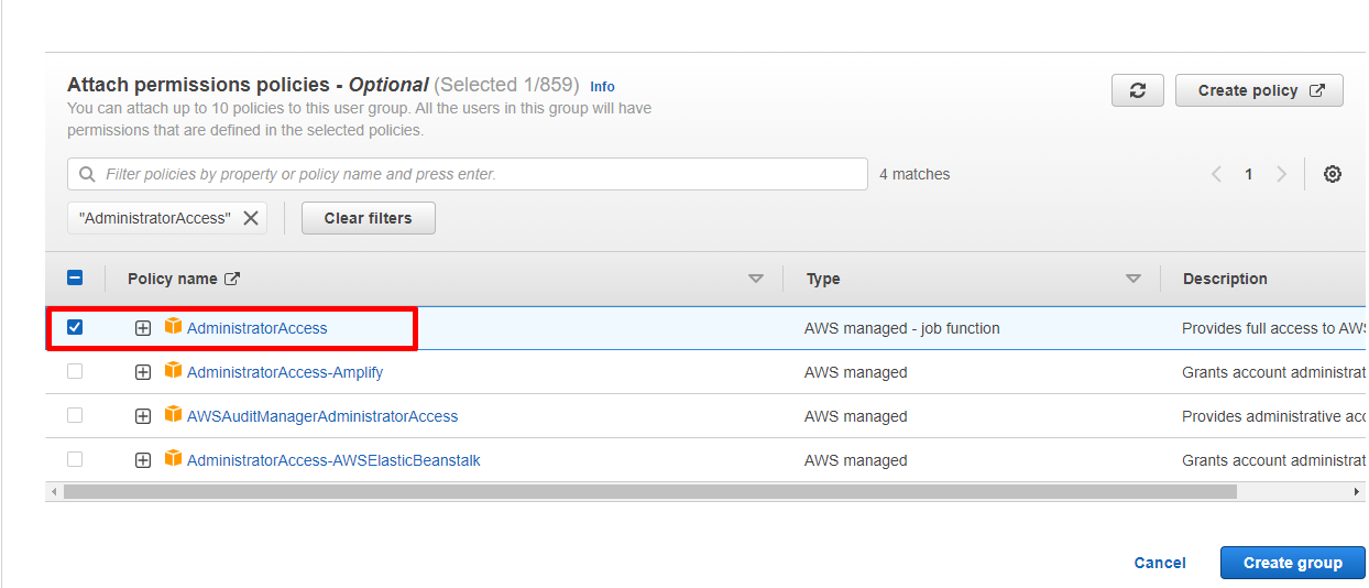 AdministratorAccessvà check vào checkbox - Click
