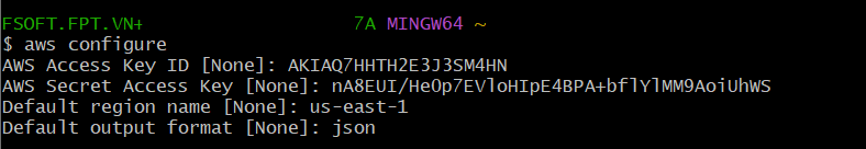 aws configure - Copy và paste thông tin Access key và Scret key trong file csv download về lúc nãy