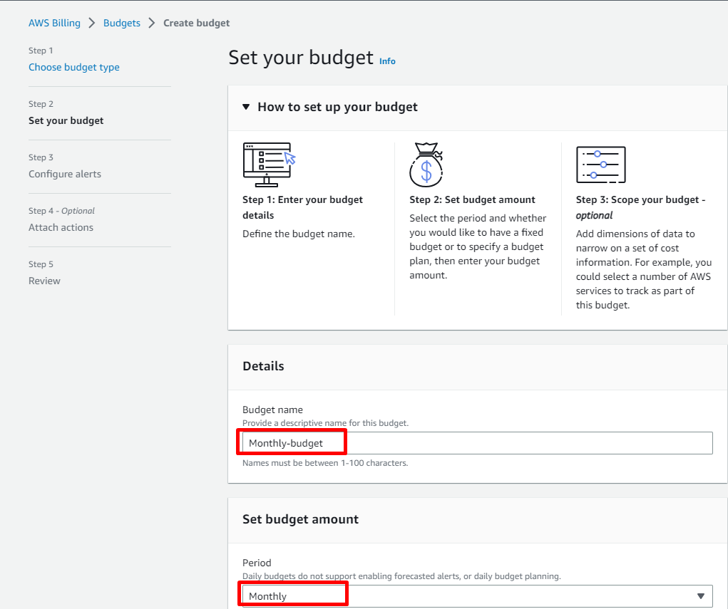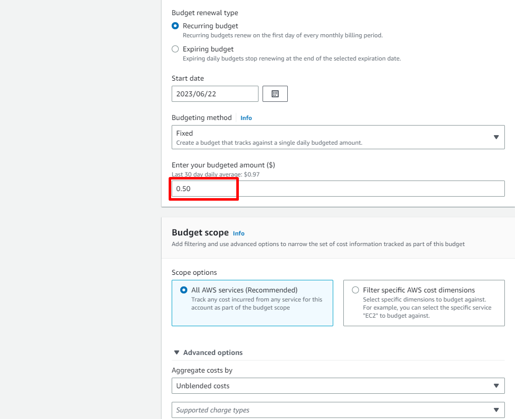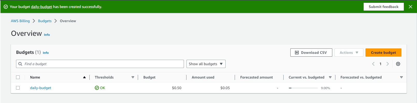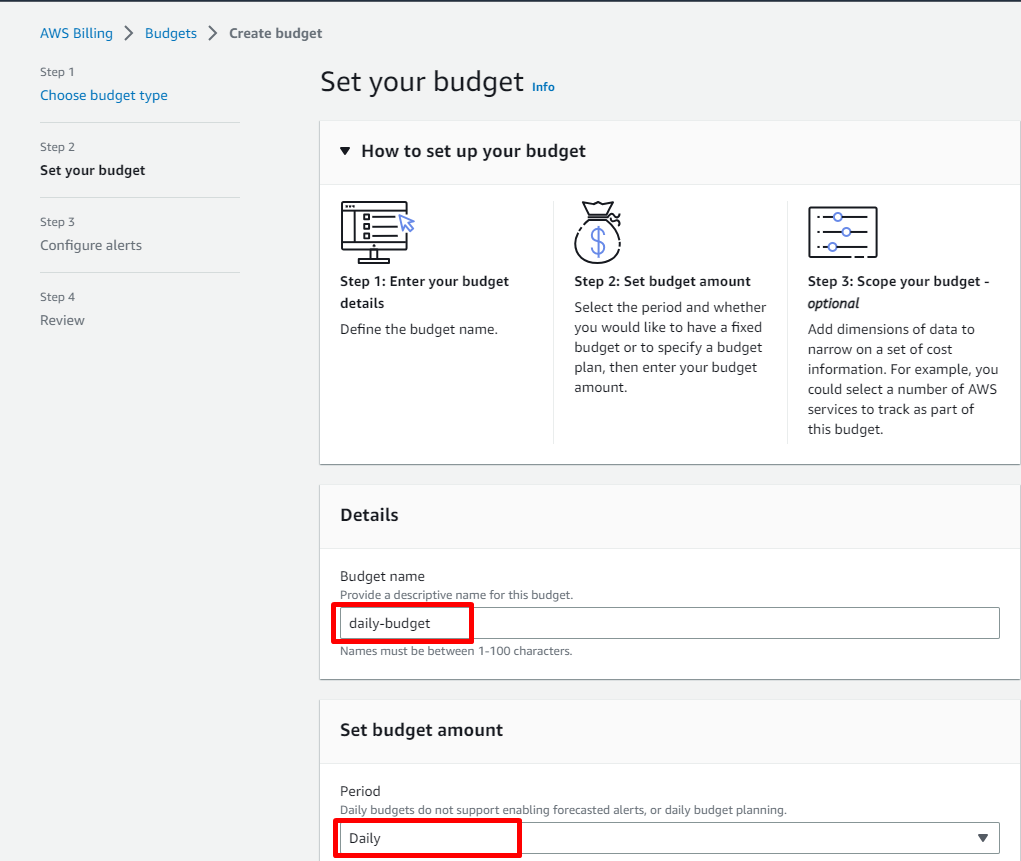 Lý do chúng ta cần setting daily budget là: Lỡ như lúc chúng ta thực hành xong và quên xóa service nào đó (chẳng hạn như EC2 không hỗ trợ free tier, NAT gateway, v.v.) thì sau 1 ngày sẽ nhận được thông báo nếu vượt quá định mức cho phép. Việc ngày giúp chúng ta nhận ra ngay và xác định được những trường hợp bị tính phí không monng muốn.