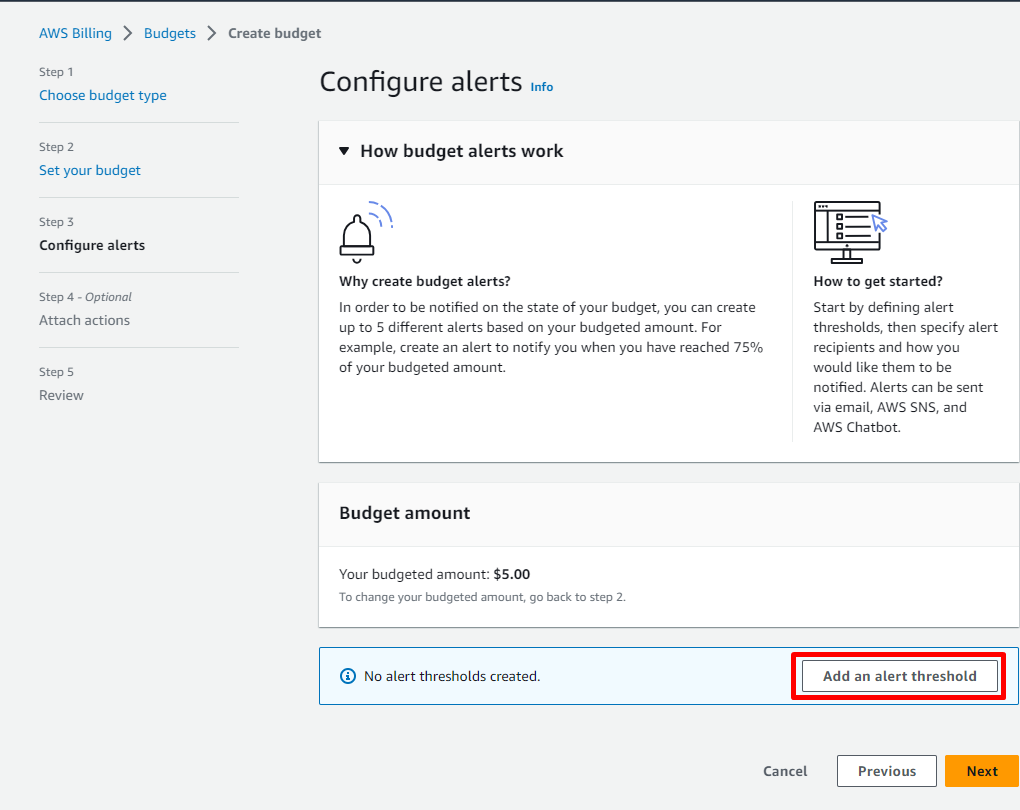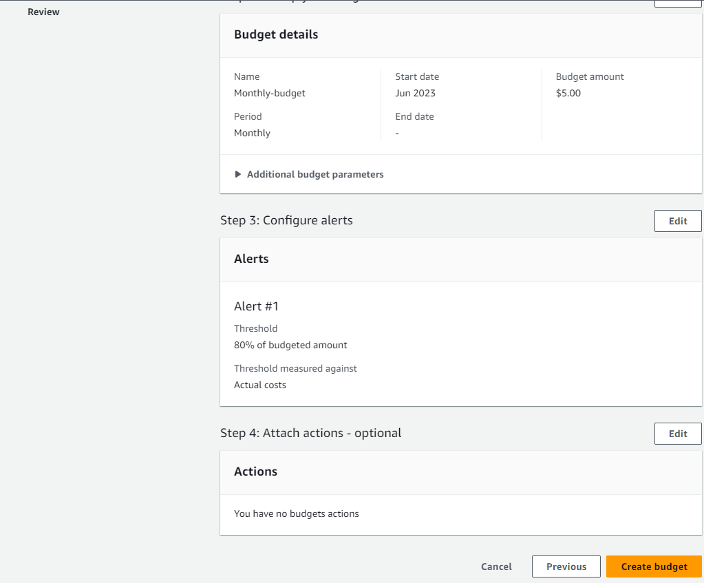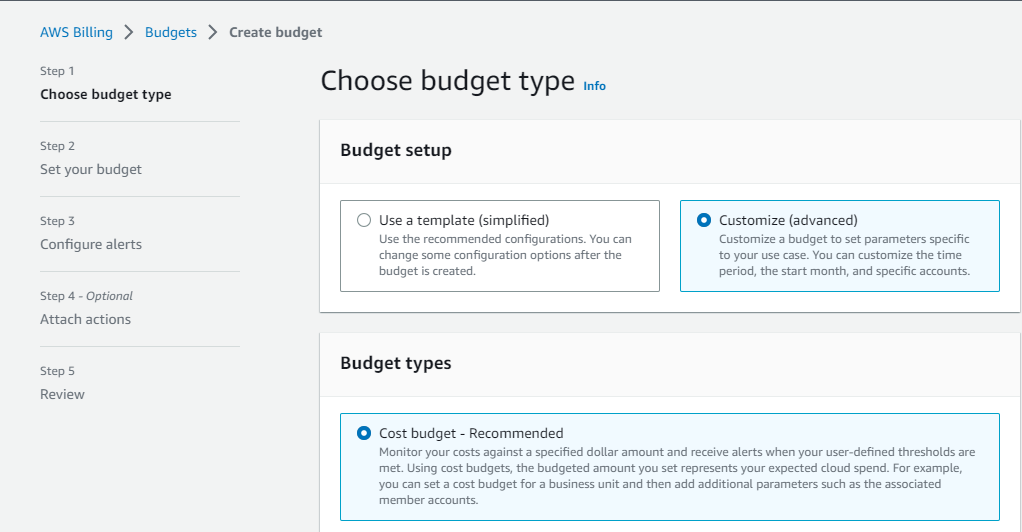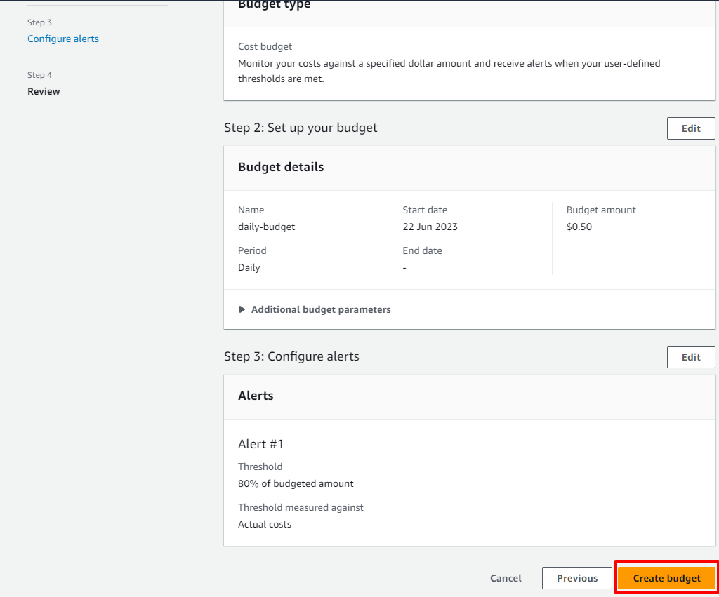 Lý do chúng ta cần setting daily budget là: Lỡ như lúc chúng ta thực hành xong và quên xóa service nào đó (chẳng hạn như EC2 không hỗ trợ free tier, NAT gateway, v.v.) thì sau 1 ngày sẽ nhận được thông báo nếu vượt quá định mức cho phép. Việc ngày giúp chúng ta nhận ra ngay và xác định được những trường hợp bị tính phí không monng muốn.