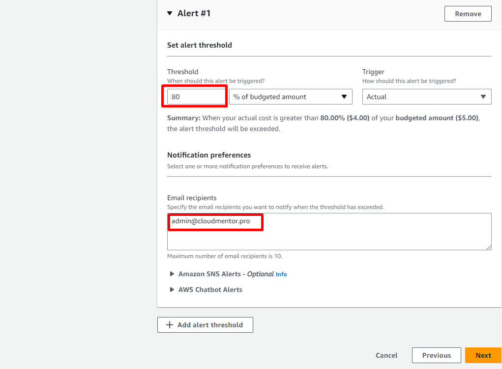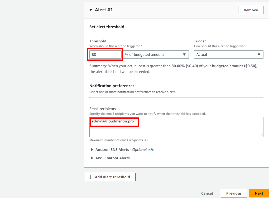 Bạn có thể tiếp tục Add thêm Alert cho ngưỡng 100% actual costs